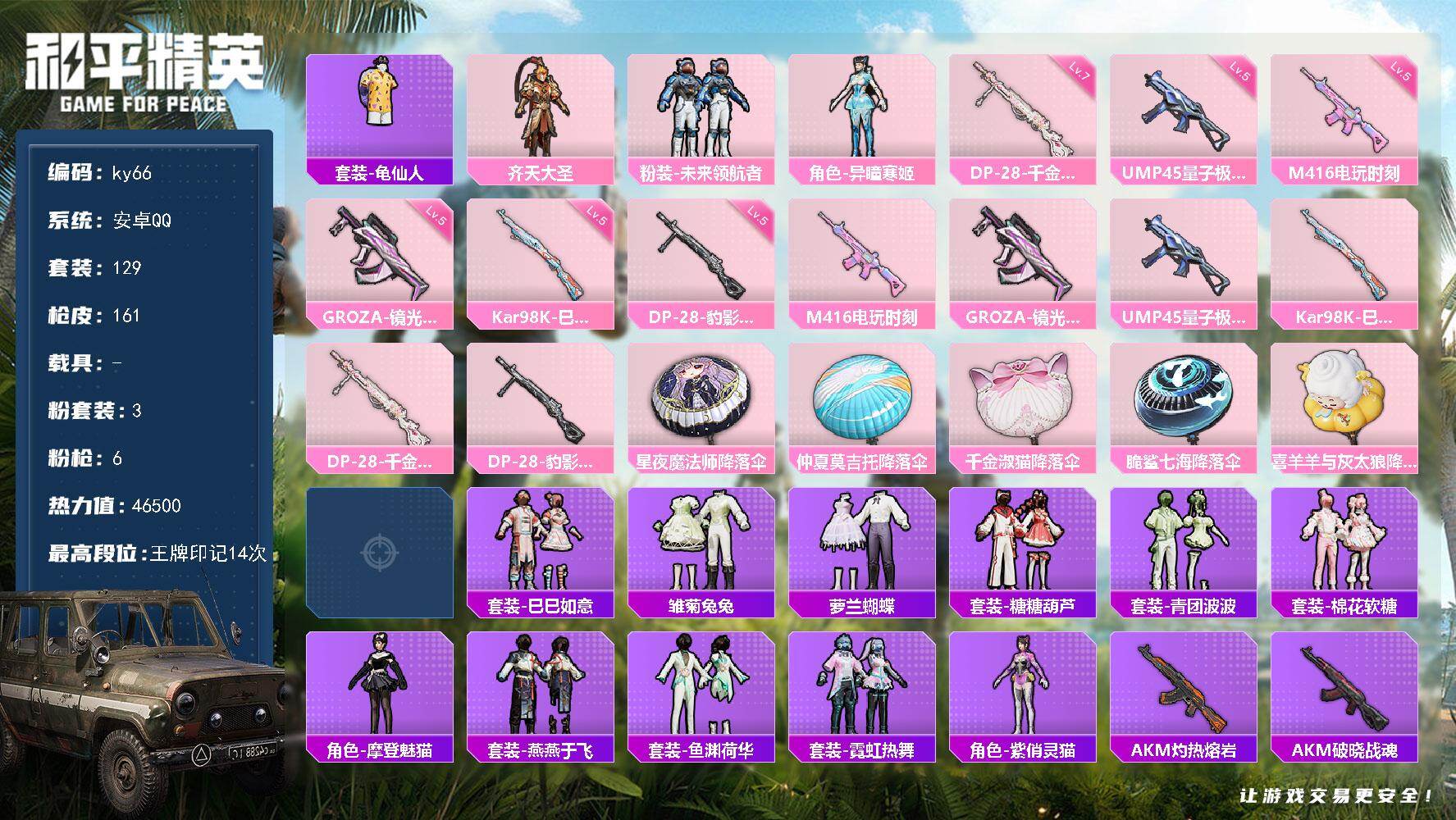[16975926]安卓 手Q-3粉装-6特效枪-0载具-1粉色飞行器-46500热力值-14王牌印记-129套装-161枪皮 【热门品类】:套装-龟仙人 【粉色套装】:粉装-齐天大圣,粉装-未来领航者,角色-异瞳寒姬 【粉色枪皮等级】:M416-电玩时刻(五级),GROZA-镜光银凌(五级),UMP45-量子极限(五级),Kar98K-巳巳如意(五级),DP-28-千金淑猫(七级),DP-28-豹影疾电(五级) 【粉色枪皮】:M416-电玩时刻,GROZA-镜光银凌,UMP45-量子极限,Kar98K-巳巳如意,DP-28-千金淑猫,DP-28-豹影疾电 【粉色降落伞】:星夜魔法师降落伞,仲夏莫吉托降落伞,千金淑猫降落伞,脆鲨七海降落伞,喜羊羊与灰太狼降落伞,炫彩糖果降落伞 【稀有套装】:套装-龟仙人,套装-巳巳如意,套装-炫彩糖果,套装-雏菊兔兔,套装-萝兰蝴蝶,套装-糖糖葫芦,套装-青团波波,套装-棉花软糖,角色-摩登魅猫,套装-燕燕于飞,套装-鱼渊荷华,套装-霓虹热舞,角色-紫俏灵猫 【稀有枪皮】:AUG-冰晶雪宝,AKM-灼热熔岩,AKM-破晓战魂,AKM-萌趣颜团子,AKM-霓虹街区,AKM-龙的传人,M16A4-幻世战舞者,M16A4-红色方程式,M16A4-蓝色火焰,M16A4-千金淑猫,SCAR-L-炫彩节奏,SCAR-L-玉兔迎春,SCAR-L-红色方程式,M416-糯团青竹,M416-红色方程式,M416-蓝色火焰,AUG-天降萌叽,AUG-耀粉歌者,QBZ-彩虹符号,QBZ-洛神天依,QBZ-银碳小老虎,M762-天降萌叽,Mk47-妙红点点,Mk47-洛神天依,AC-VAL-天降萌叽,AC-VAL-快闪甜心,AC-VAL-闲梦青缨,蜜獾-天降萌叽,蜜獾-娇憨猪猪,UZI-啾咪啾咪,UZI-天降萌叽,UZI-娇憨猪猪,UZI-炫彩节奏,UZI-红色方程式,UMP45-生命誓言,UMP45-蓝色火焰,UMP45-绒宝小鹅,UMP45-极意拳锋,Vector-彩虹符号,Vector-生命誓言,汤姆逊-天降萌叽,汤姆逊-幻影战神,汤姆逊-耀粉歌者,P90-快闪甜心,P90-飞驰魅影,P90-巳巳如意,Kar98K-彩虹符号,Kar98K-洛神天依,Kar98K-炫彩节奏,Kar98K-红色方程式,M24-炫彩节奏,AWM-圣堂之誓,AWM-垂柳戏鸭,Mini14-耀