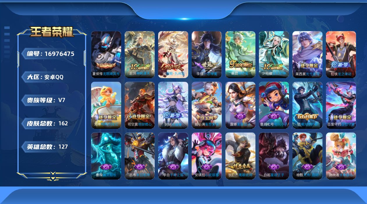 [16976475]可二次【店主推荐捡漏号!可直接换绑】安卓Q-V7-最强王者段位-127英雄-162皮肤-1典藏-4传说-35史诗