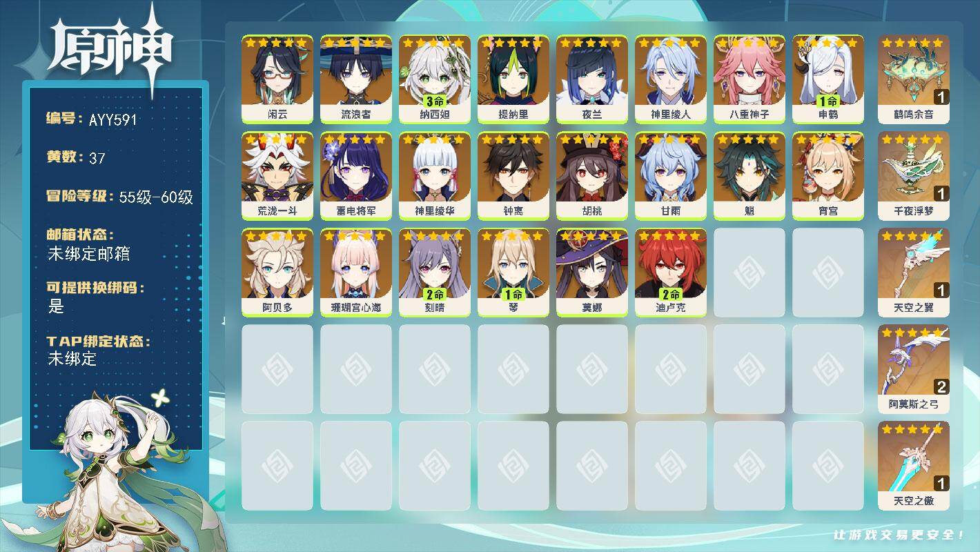[16976886]57级/37黄/男主/22个五星角色/5个五星武器 0命闲云,0命流浪者,3命纳西妲,0命提纳里,0命夜兰,0命神里绫人,0命八重神子,1命申鹤,0命荒泷一斗,0命雷电将军,0命神里绫华,0命钟离,0命胡桃,0命甘雨,0命魈,0命宵宫,0命阿贝多,0命珊瑚宫心海,2命刻晴,1命琴,0命莫娜,2命迪卢克,精1鹤鸣余音,精1千夜浮梦,精1天空之翼,精2阿莫斯之弓,精1天空之傲