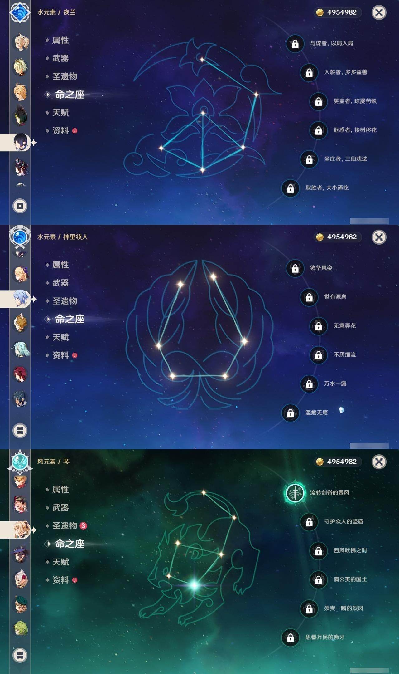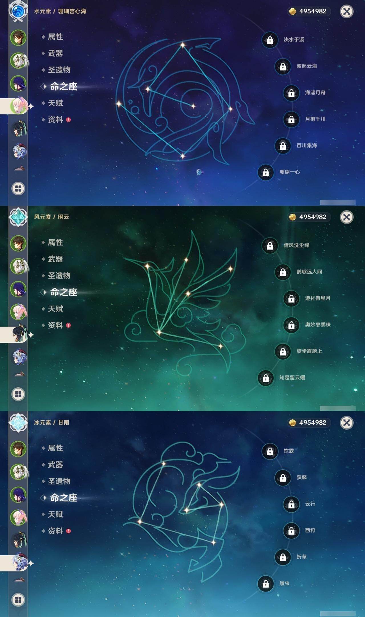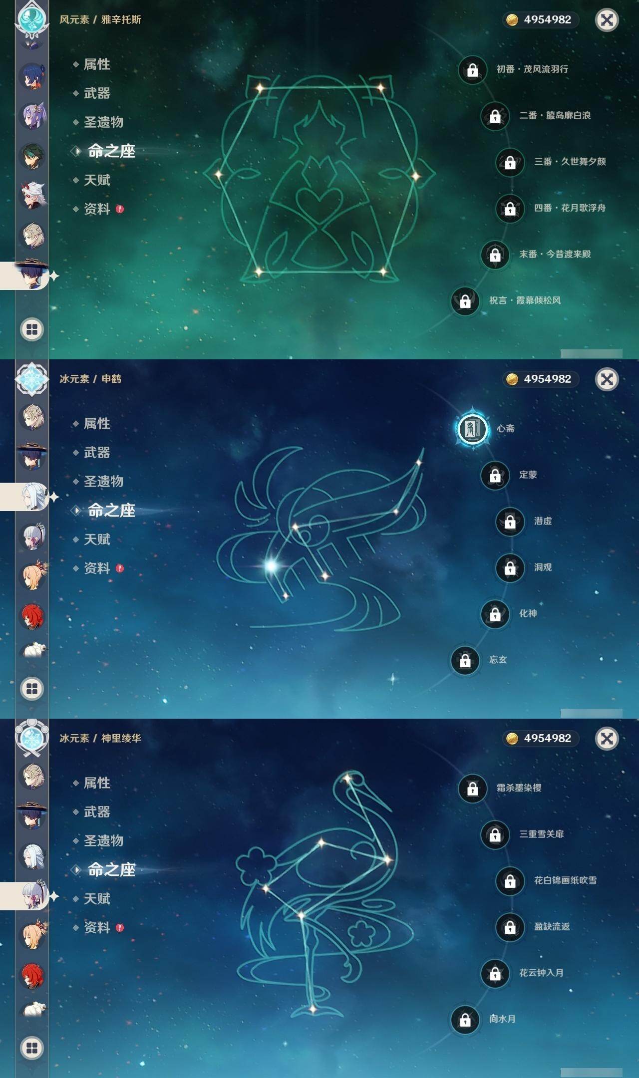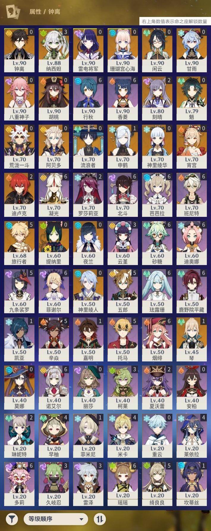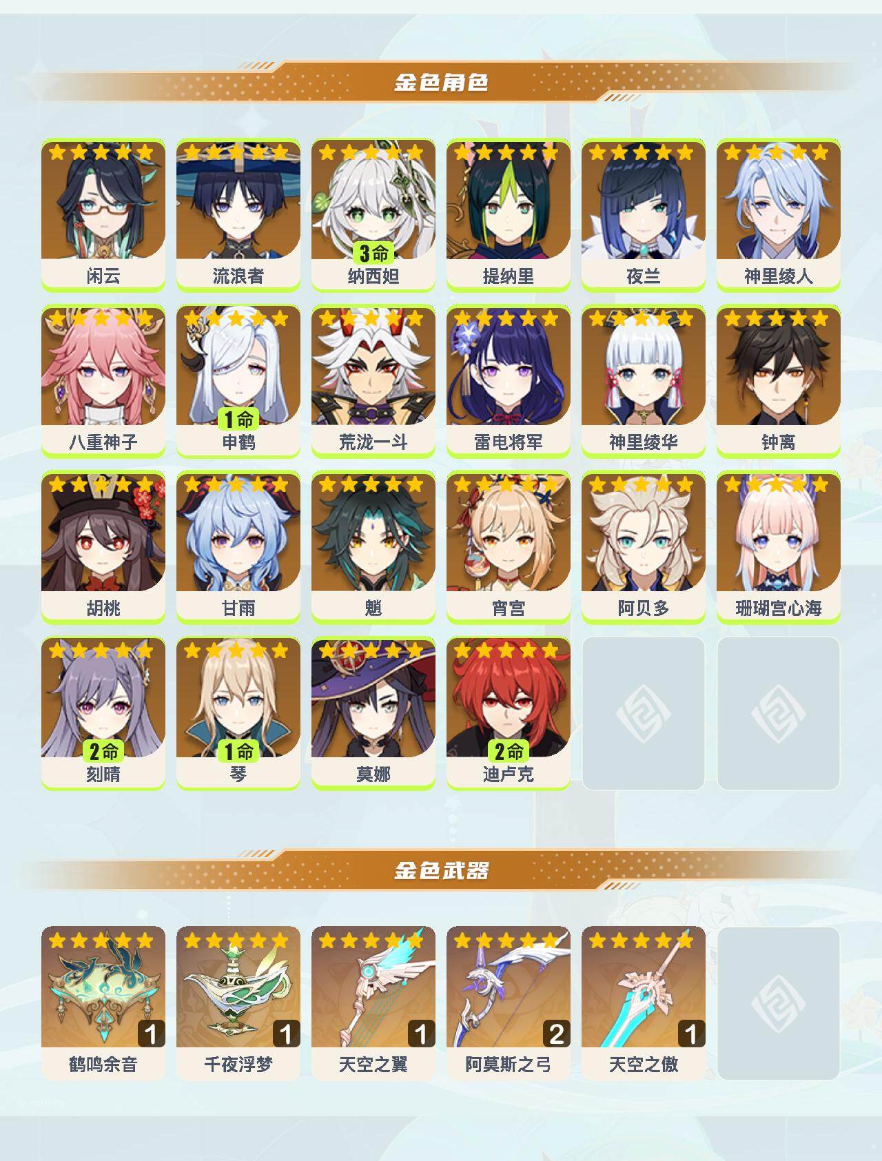 0命闲云,0命流浪者,3命纳西妲,0命提纳里,0命夜兰,0命神里绫人,0命八重神子,1命申鹤,0命荒泷一斗,0命雷电将军,0命神里绫华,0命钟离,0命胡桃,0命甘雨,0命魈,0命宵宫,0命阿贝多,0命珊瑚宫心海,2命刻晴,1命琴,0命莫娜,2命迪卢克,精1鹤鸣余音,精1千夜浮梦,精1天空之翼,精2阿莫斯之弓,精1天空之傲