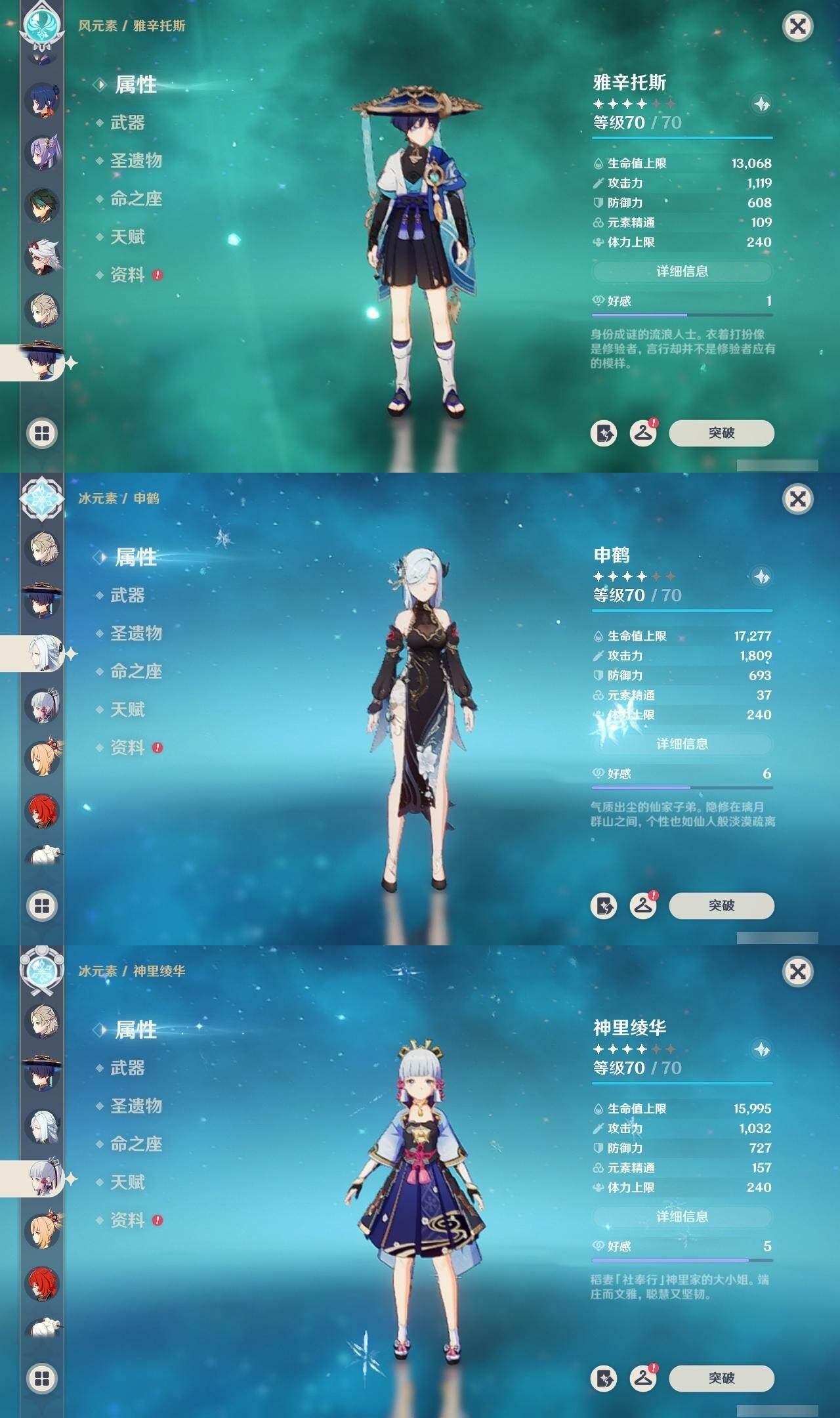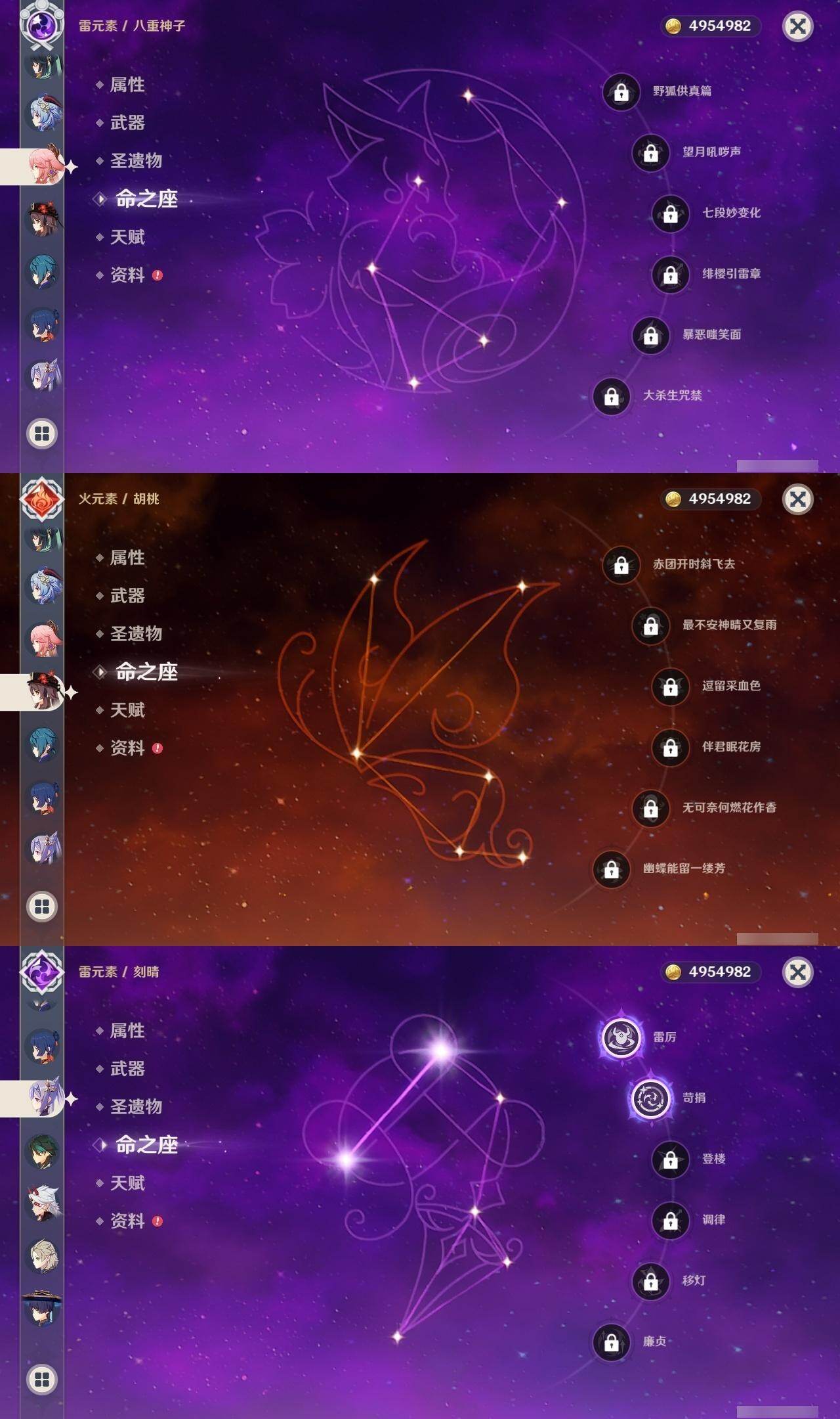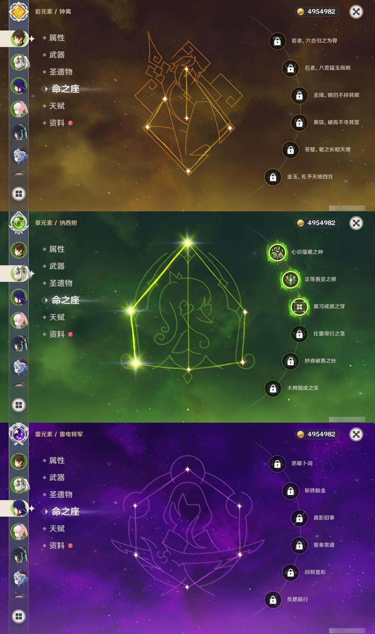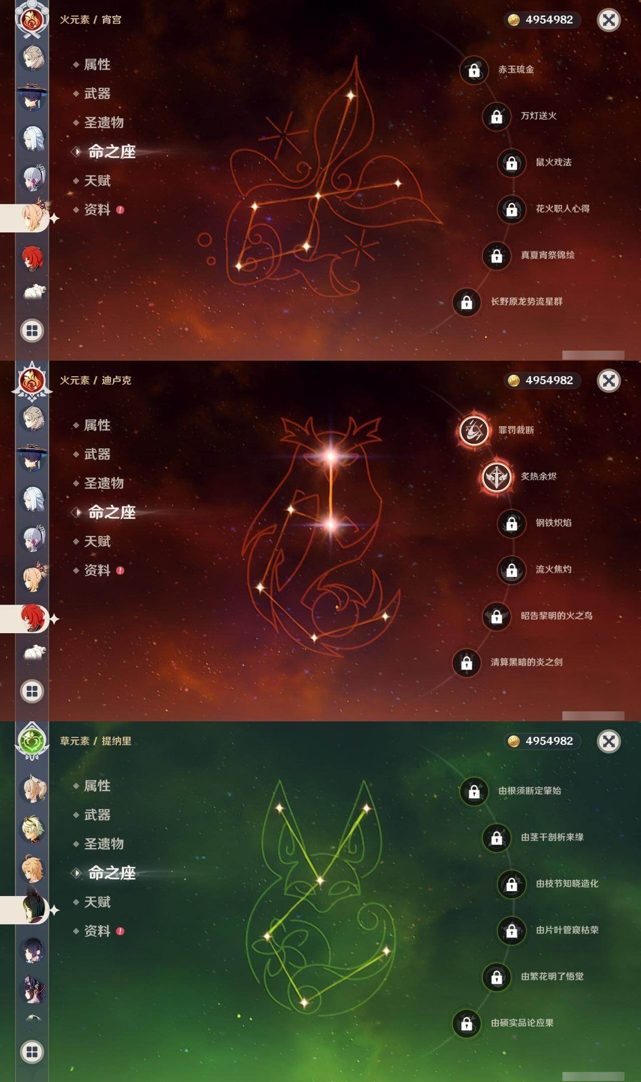 0命闲云,0命流浪者,3命纳西妲,0命提纳里,0命夜兰,0命神里绫人,0命八重神子,1命申鹤,0命荒泷一斗,0命雷电将军,0命神里绫华,0命钟离,0命胡桃,0命甘雨,0命魈,0命宵宫,0命阿贝多,0命珊瑚宫心海,2命刻晴,1命琴,0命莫娜,2命迪卢克,精1鹤鸣余音,精1千夜浮梦,精1天空之翼,精2阿莫斯之弓,精1天空之傲