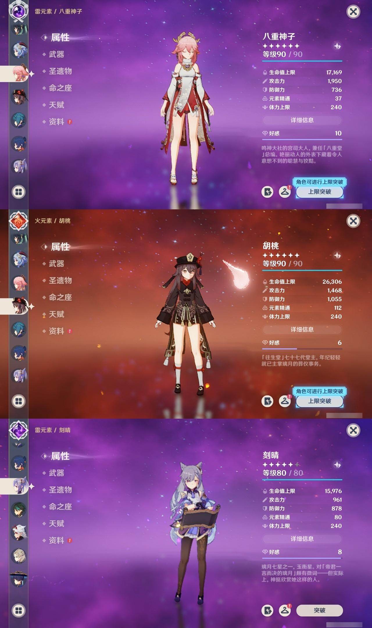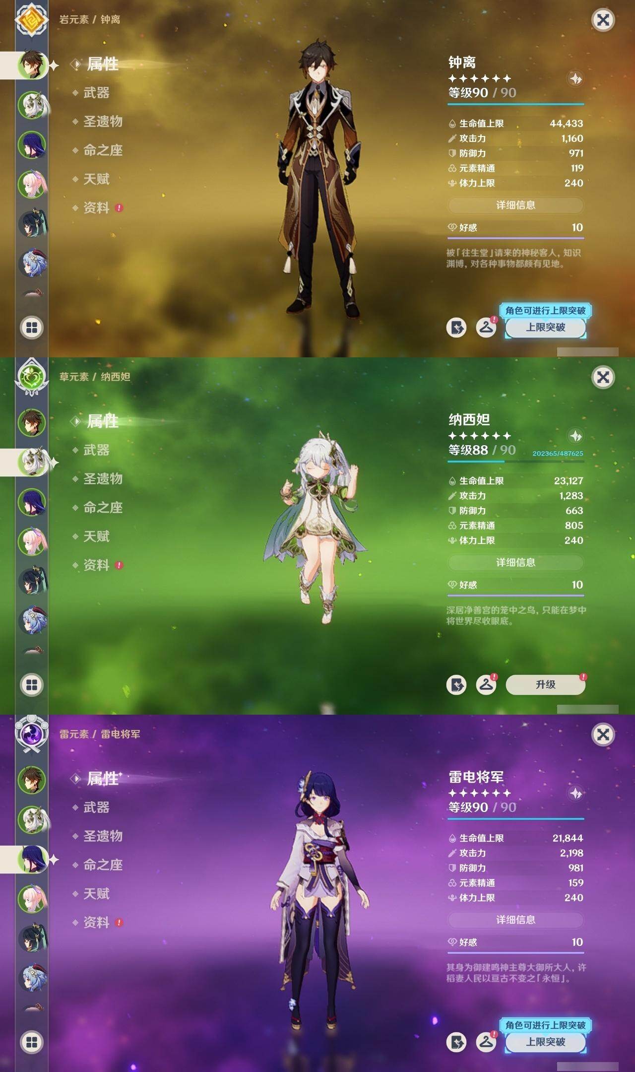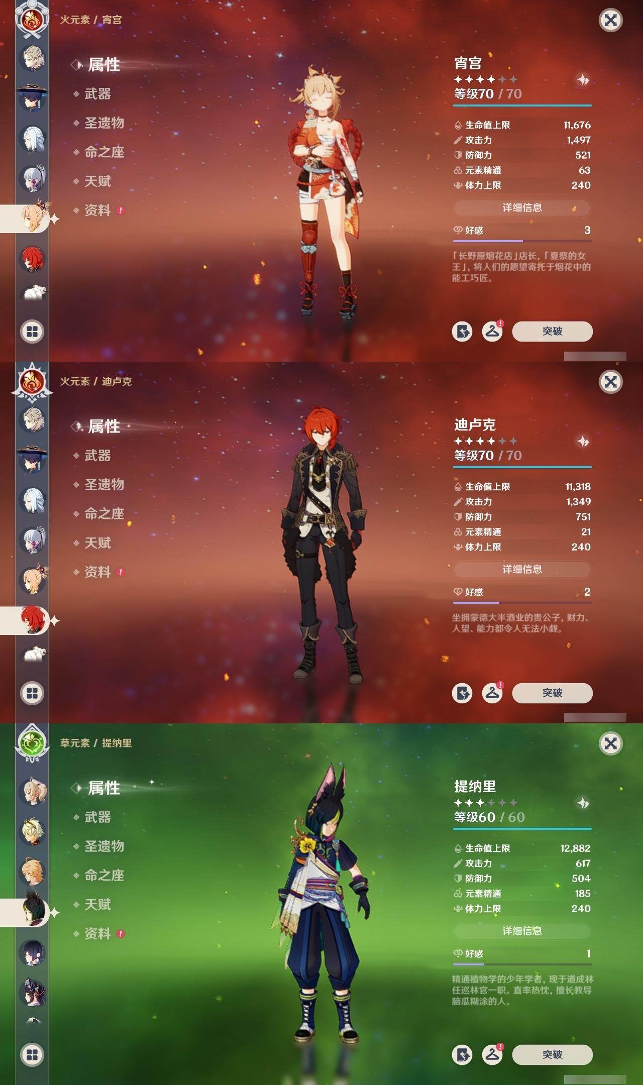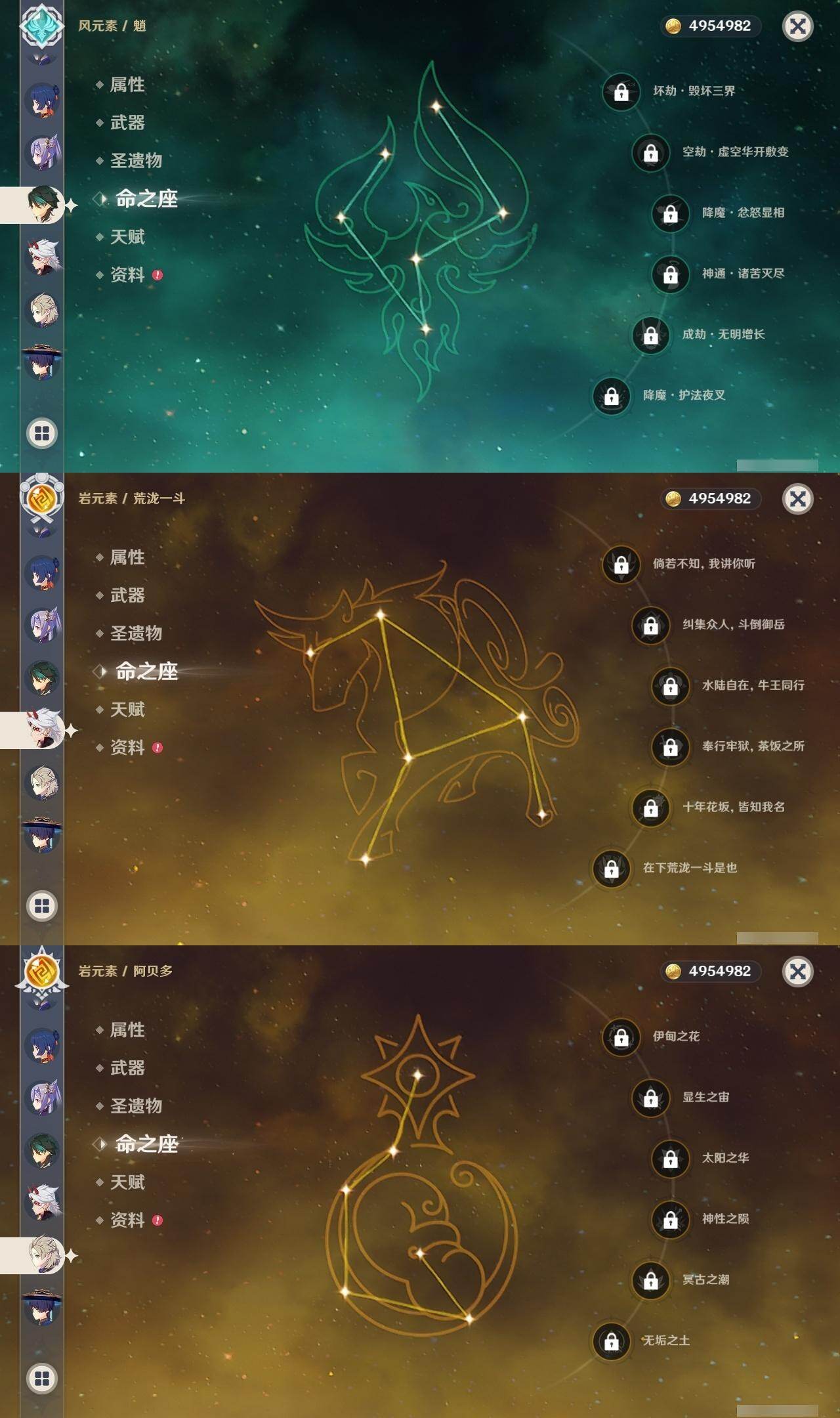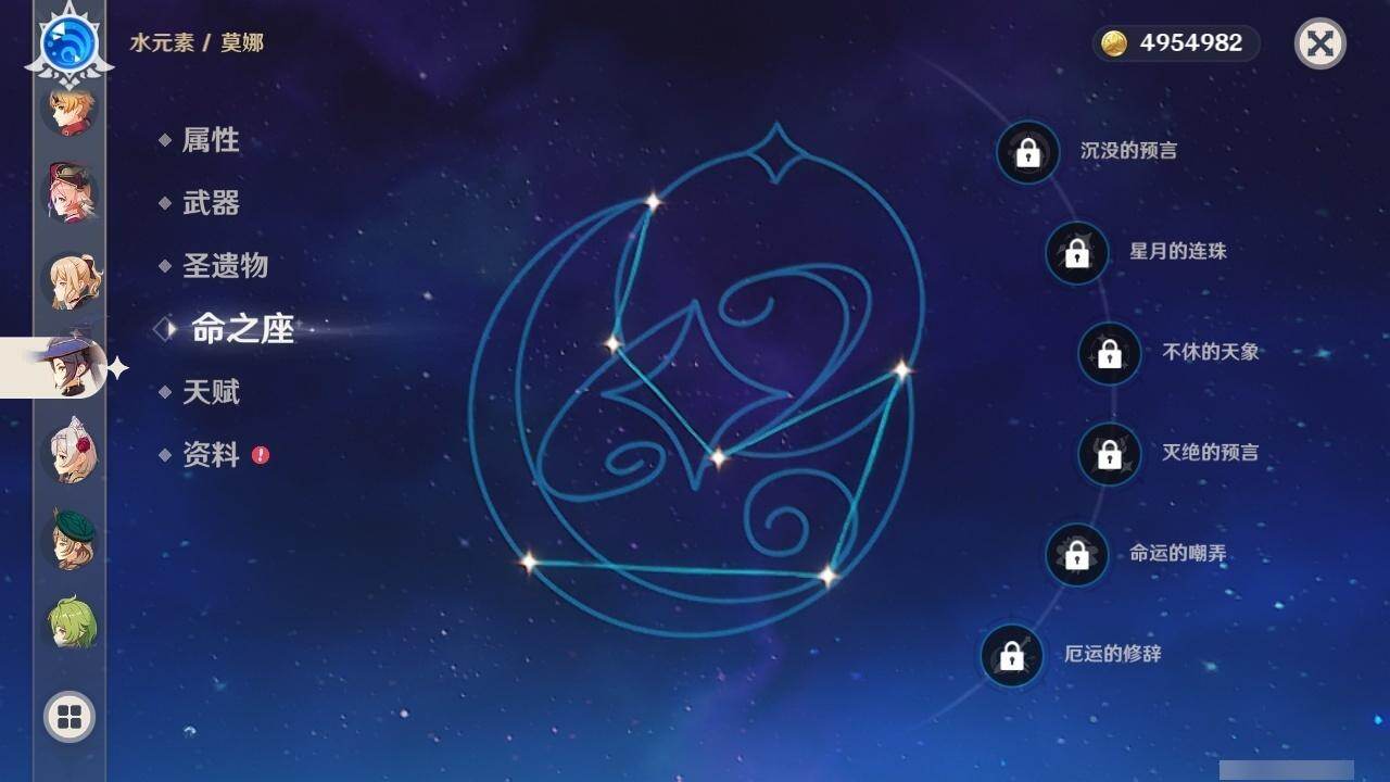 0命闲云,0命流浪者,3命纳西妲,0命提纳里,0命夜兰,0命神里绫人,0命八重神子,1命申鹤,0命荒泷一斗,0命雷电将军,0命神里绫华,0命钟离,0命胡桃,0命甘雨,0命魈,0命宵宫,0命阿贝多,0命珊瑚宫心海,2命刻晴,1命琴,0命莫娜,2命迪卢克,精1鹤鸣余音,精1千夜浮梦,精1天空之翼,精2阿莫斯之弓,精1天空之傲