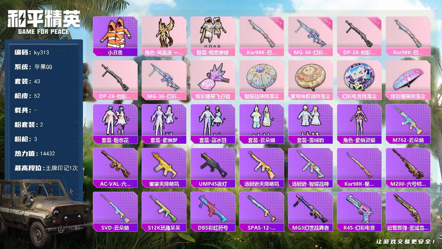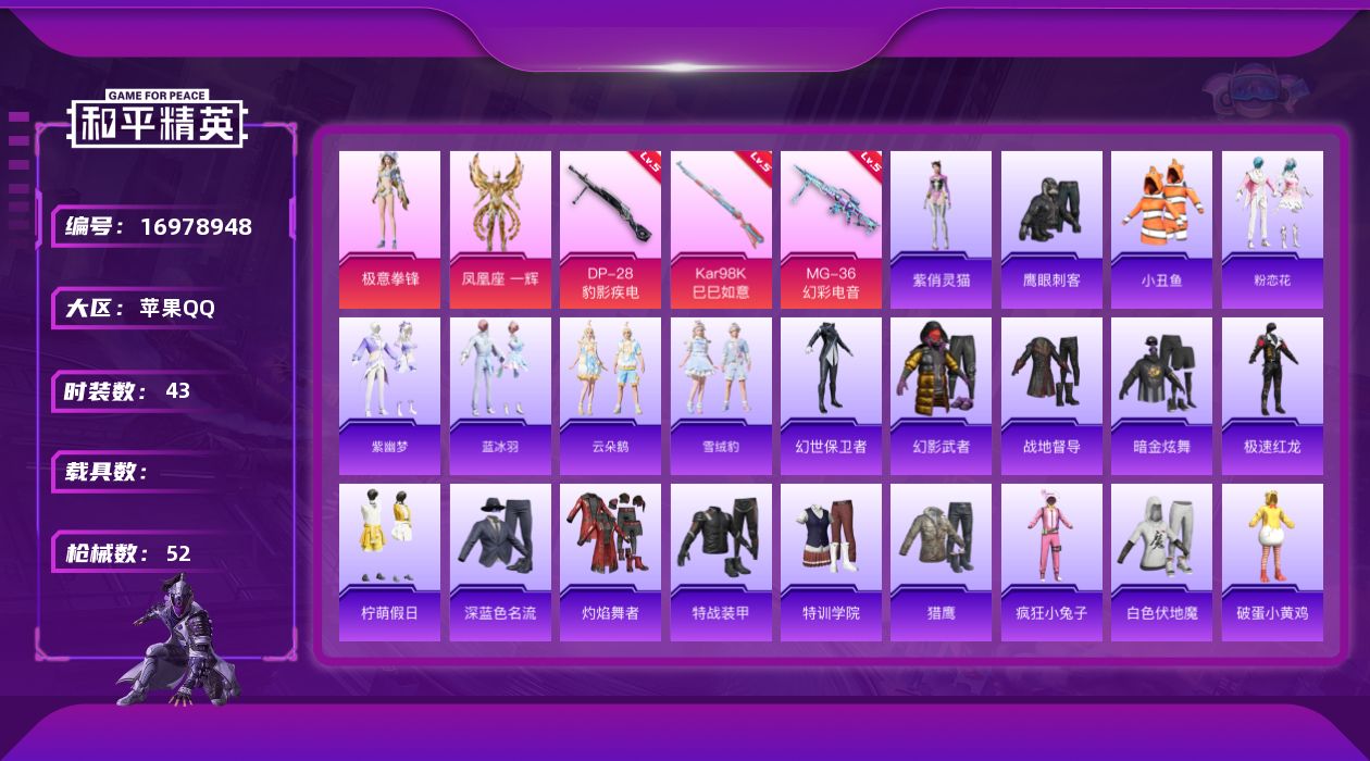[16978948]苹果 手Q-2粉装-3特效枪-0载具-1粉色飞行器-14432热力值-1王牌印记-43套装-52枪皮 【热门品类】:套装-小丑鱼 【粉色套装】:角色-凤凰座 一辉,粉装-极意拳锋 【粉色枪皮等级】:Kar98K-巳巳如意(五级),DP-28-豹影疾电(五级),MG-36-幻彩电音(五级) 【粉色枪皮】:Kar98K-巳巳如意,DP-28-豹影疾电,MG-36-幻彩电音 【粉色飞行器】:炫彩糖果飞行器 【粉色降落伞】:智耀战神降落伞,星穹咏叹调降落伞,幻彩电音降落伞,炫彩糖果降落伞 【稀有套装】:套装-炫彩糖果,套装-粉恋花,套装-紫幽梦,套装-蓝冰羽,套装-云朵鹅,套装-雪绒豹,角色-紫俏灵猫 【稀有枪皮】:M762-云朵鹅,AC-VAL-六号稻草人,蜜獾-天降萌叽,UMP45-夜灯,汤姆逊-天降萌叽,汤姆逊-智耀战神,Kar98K-星穹咏叹调,M200-六号稻草人,SVD-云朵鹅,S12K-玩趣呆呆,DBS-彩虹符号,SPAS-12-云朵鹅,MG3-幻世战舞者,R45-幻彩电音,短管霰弹-圣域龙灵,沙漠之鹰-云朵鹅,大砍刀-云朵鹅 【其他套装】:套装-幻世保卫者,套装-幻影武者,套装-战地督导,套装-暗金炫舞,套装-极速红龙,套装-柠萌假日,套装-深蓝色名流,套装-灼焰舞者,套装-特战装甲,套装-特训学院,套装-猎鹰,套装-疯狂小兔子,套装-白色伏地魔,套装-破蛋小黄鸡,套装-蓝彩潮人,套装-魅力单车,套装-黄色名流,套装-黑色伏地魔,套装-鹰眼刺客,套装-冰冻风暴 【营地ID】:990271966
