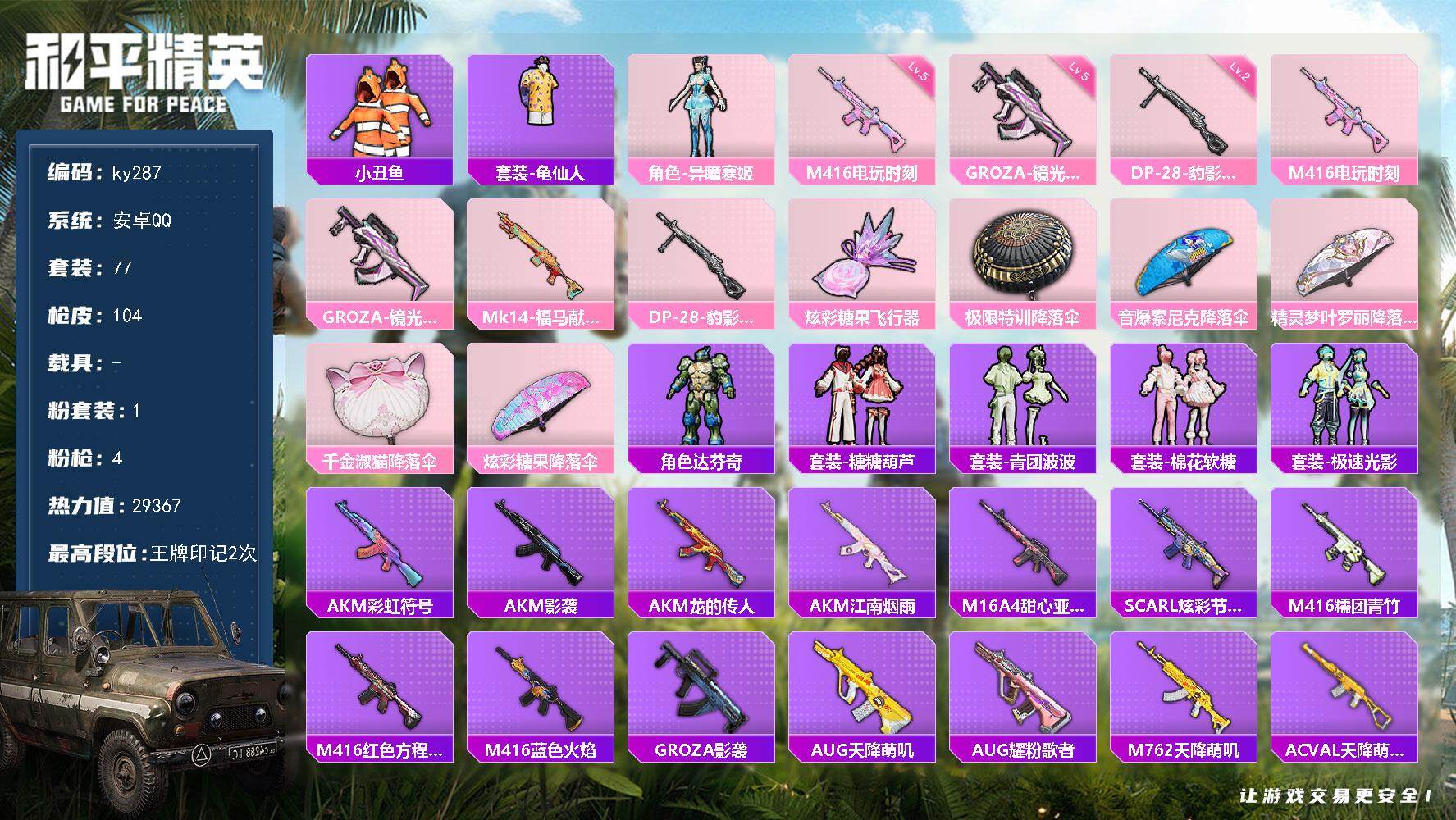 [16979019]安卓 手Q-1粉装-4特效枪-0载具-1粉色飞行器-29367热力值-2王牌印记-77套装-104枪皮