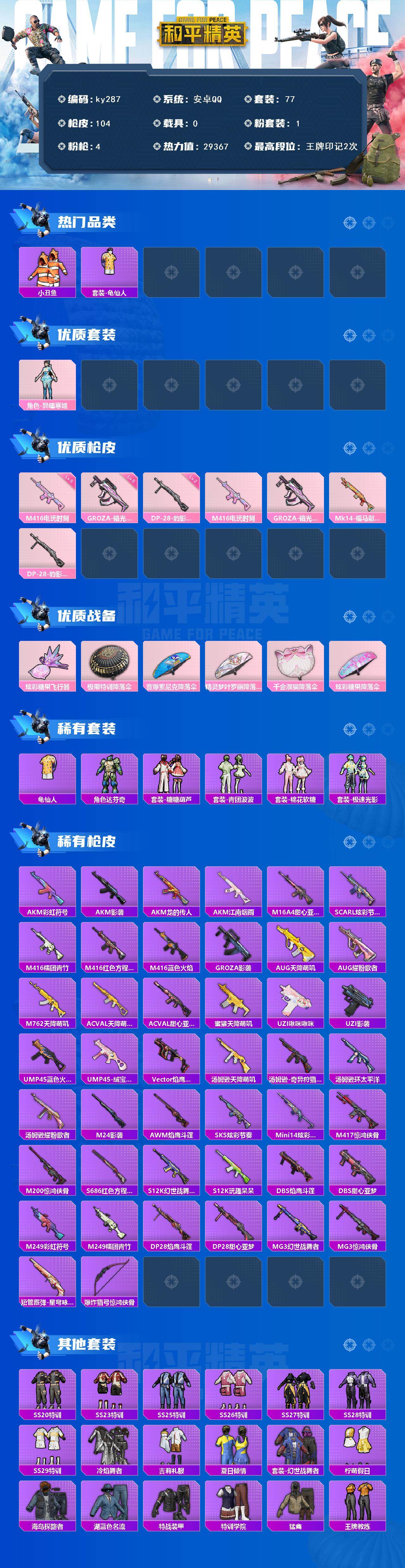 [16979019]安卓 手Q-1粉装-4特效枪-0载具-1粉色飞行器-29367热力值-2王牌印记-77套装-104枪皮 【热门品类】:套装-小丑鱼,套装-龟仙人 【粉色套装】:角色-异瞳寒姬 【粉色枪皮等级】:M416-电玩时刻(五级),GROZA-镜光银凌(五级),DP-28-豹影疾电(二级) 【粉色枪皮】:M416-电玩时刻,GROZA-镜光银凌,Mk14-福马献瑞,DP-28-豹影疾电 【粉色飞行器】:炫彩糖果飞行器 【粉色降落伞】:极限特训降落伞,音爆索尼克降落伞,精灵梦叶罗丽降落伞,千金淑猫降落伞,炫彩糖果降落伞 【稀有套装】:套装-龟仙人,套装-雪国风尚,套装-炫彩糖果,角色-达芬奇,套装-糖糖葫芦,套装-青团波波,套装-棉花软糖,套装-极速光影 【稀有枪皮】:AKM-彩虹符号,AKM-影袭,AKM-江南烟雨,AKM-龙的传人,M16A4-甜心亚梦,SCAR-L-炫彩节奏,M416-糯团青竹,M416-红色方程式,M416-蓝色火焰,GROZA-影袭,AUG-天降萌叽,AUG-耀粉歌者,M762-天降萌叽,AC-VAL-天降萌叽,AC-VAL-甜心亚梦,蜜獾-天降萌叽,UZI-啾咪啾咪,UZI-影袭,UMP45-蓝色火焰,UMP45-绒宝小鹅,Vector-焰鹰斗篷,汤姆逊-天降萌叽,汤姆逊-奇异狩猎者,汤姆逊-环太平洋,汤姆逊-耀粉歌者,M24-影袭,AWM-焰鹰斗篷,SKS-炫彩节奏,Mini14-炫彩节奏,M417-惊鸿侠骨,M200-惊鸿侠骨,S686-红色方程式,S12K-玩趣呆呆,S12K-幻世战舞者,DBS-焰鹰斗篷,DBS-甜心亚梦,M249-彩虹符号,M249-糯团青竹,DP-28-焰鹰斗篷,DP-28-甜心亚梦,MG3-幻世战舞者,MG3-惊鸿侠骨,短管霰弹-星穹咏叹调,爆炸猎弓-惊鸿侠骨 【其他套装】:套装-SS20特训,套装-SS23特训,套装-SS25特训,套装-SS26特训,套装-SS27特训,套装-SS28特训,套装-SS29特训,套装-冷焰舞者,套装-吉莉礼服,套装-夏日倾情,套装-幻世战舞者,套装-柠萌假日,套装-海岛探路者,套装-湖蓝色名流,套装-特战装甲,套装-特训学院,套装-猛禽,套装-王牌教练,套装-白色伏地魔,套装-破晓战魂,套装-神秘领域,套装-空岛之星,套装-空投萌叽,套装-竞技名士,套装-竞技达人朋克,套装-红色运动,