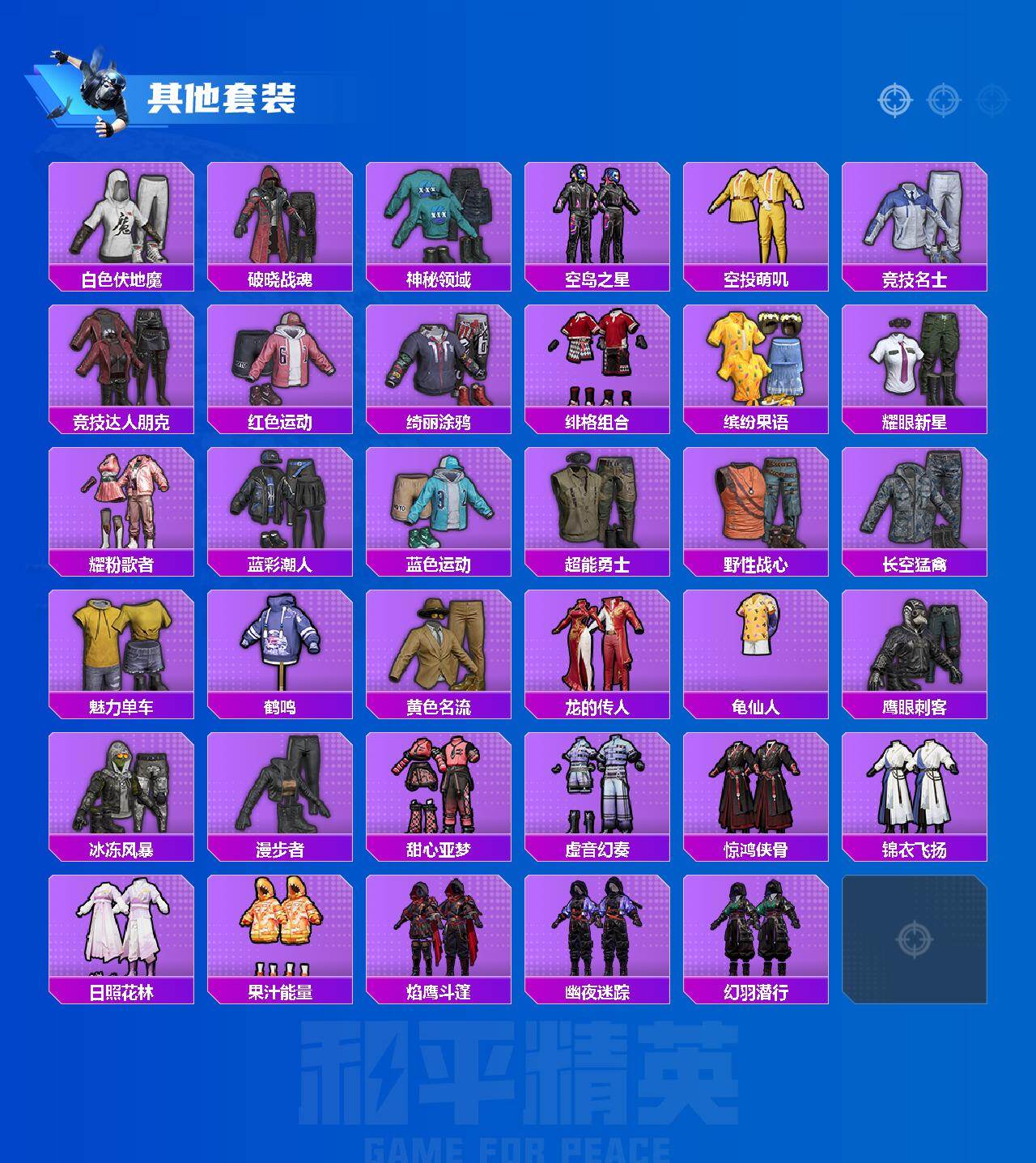 【其他套装】:套装-SS20特训,套装-SS23特训,套装-SS25特训,套装-SS26特训,套装-SS27特训,套装-SS28特训,套装-SS29特训,套装-冷焰舞者,套装-吉莉礼服,套装-夏日倾情,套装-幻世战舞者,套装-柠萌假日,套装-海岛探路者,套装-湖蓝色名流,套装-特战装甲,套装-特训学院,套装-猛禽,套装-王牌教练,套装-白色伏地魔,套装-破晓战魂,套装-神秘领域,套装-空岛之星,套装-空投萌叽,套装-竞技名士,套装-竞技达人朋克,套装-红色运动,
