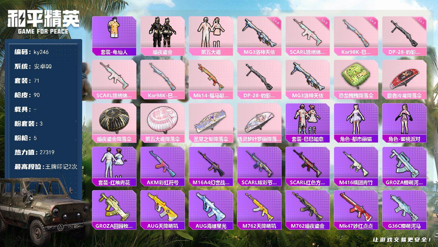 [16980201]安卓 手Q-3粉装-5特效枪-0载具-0粉色飞行器-27319热力值-2王牌印记-71套装-90枪皮 【热门品类】:套装-龟仙人 【粉色套装】:粉装-暗夜鎏金,粉装-第五大道 【粉色枪皮等级】:SCAR-L-锦绣绵绵(五级),Kar98K-巳巳如意(五级),DP-28-豹影疾电(一级),MG3-洛神天依(六级) 【粉色枪皮】:SCAR-L-锦绣绵绵,Kar98K-巳巳如意,Mk14-福马献瑞,DP-28-豹影疾电,MG3-洛神天依 【粉色降落伞】:恐龙拽拽降落伞,歌者泠鸢降落伞,暗夜鎏金降落伞,第五大道降落伞,圣堂之誓降落伞,精灵梦叶罗丽降落伞 【稀有套装】:套装-龟仙人,套装-巳巳如意,角色-都市丽猫,角色-蜜桃派对,套装-红釉青花 【稀有枪皮】:AKM-彩虹符号,M16A4-幻世战舞者,SCAR-L-炫彩节奏,SCAR-L-红色方程式,M416-糯团青竹,GROZA-懵萌河马,GROZA-田园牧歌,AUG-天降萌叽,AUG-海螺星光,M762-天降萌叽,M762-暗夜鎏金,Mk47-妙红点点,G36C-懵萌河马,AC-VAL-快闪甜心,蜜獾-天降萌叽,UZI-啾咪啾咪,UMP45-仲夏莫吉托,UMP45-涂山之恋,UMP45-蓝色火焰,Vector-焰鹰斗篷,Vector-彩虹符号,Vector-田园牧歌,汤姆逊-暗夜鎏金,汤姆逊-耀粉歌者,MP5K-飒粉甜心,P90-快闪甜心,Kar98K-彩虹符号,Kar98K-洛神天依,M24-炫彩节奏,AWM-焰鹰斗篷,AWM-恐龙拽拽,AWM-音爆索尼克,SKS-炫彩节奏,SKS-糯团青竹,VSS-田园牧歌,Mini14-旋转彩虹,Mini14-涂山之恋,SLR-彩虹符号,QBU-飒粉甜心,莫辛纳甘-懵萌河马,莫辛纳甘-蜜语绒猫,AMR-妙红点点,MK20-H-快闪甜心,MK20-H-莲影清波,S1897-暗夜鎏金,S12K-破晓战魂,DBS-焰鹰斗篷,DBS-圣堂之誓,DBS-彩虹符号,DBS-第五大道,SPAS-12-田园牧歌,M249-妙红点点,M249-糯团青竹,DP-28-焰鹰斗篷,MG3-妙红点点,PKM-懵萌河马,沙漠之鹰-快闪甜心,爆炸猎弓-喜羊羊与灰太狼,撬棍-冷漠罗丽 【其他套装】:套装-SS22特训,套装-SS23特训,套装-SS24特训,套装-SS26特训,套装-SS27特训,套装-光之冒险,
