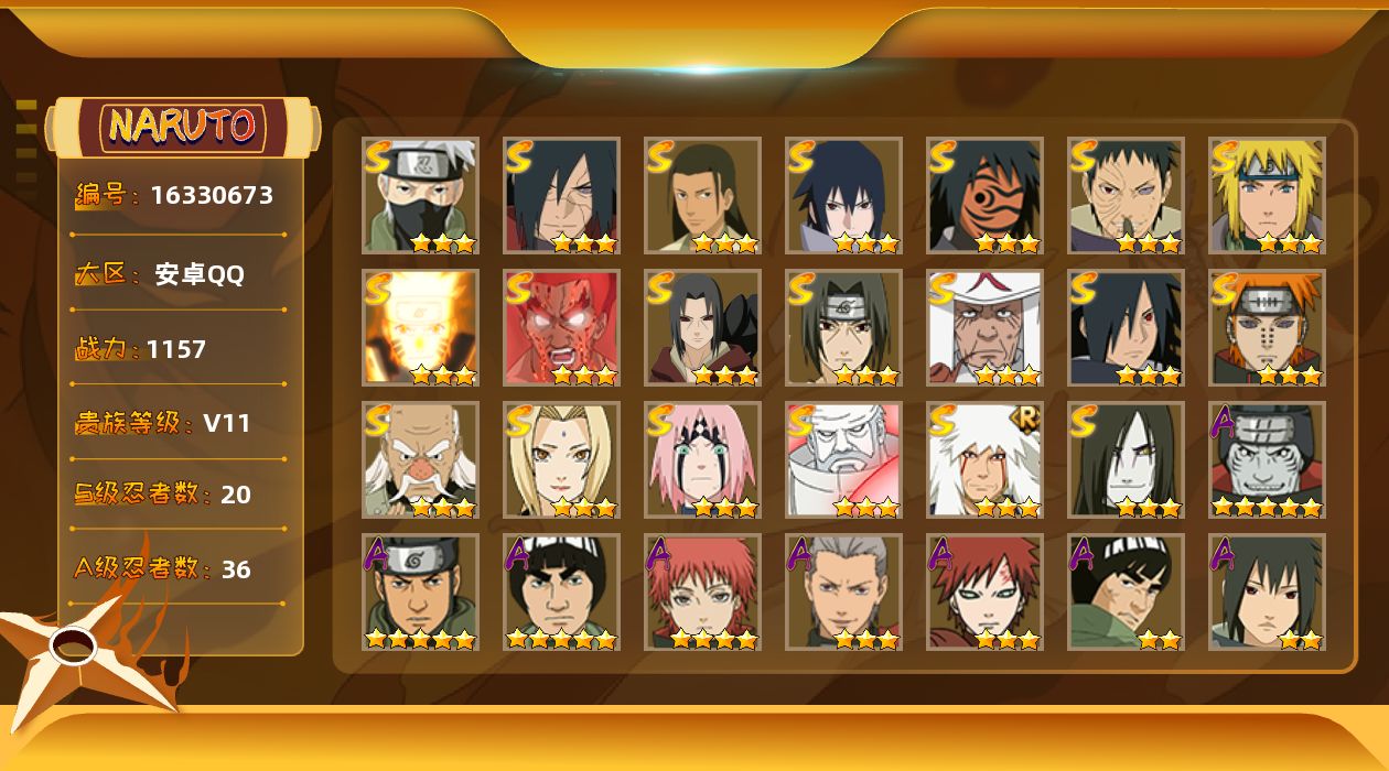 【S级忍者】:宇智波鼬「秽土转生」(3星),宇智波斑「秽土转生·解」(3星),大野木「忍界大战」(3星),春野樱「忍界大战」(3星),宇智波带土「忍界大战」(3星),宇智波鼬「须佐能乎」(3星),旗木卡卡西「须佐能乎」(3星),宇智波斑「木叶创立」(3星),千手柱间「木叶创立」(3星),自来也「舞之豪杰」(3星),大蛇丸(3星),纲手(3星),猿飞日斩(3星),波风水门(3星),神秘面具男「红夜之刃」(3星),漩涡鸣人「九喇嘛连结」(3星),迈特凯「死门」(3星),佩恩「天道」(3星),宇智波佐助「永恒万花筒」(3星),大筒木金式(3星)