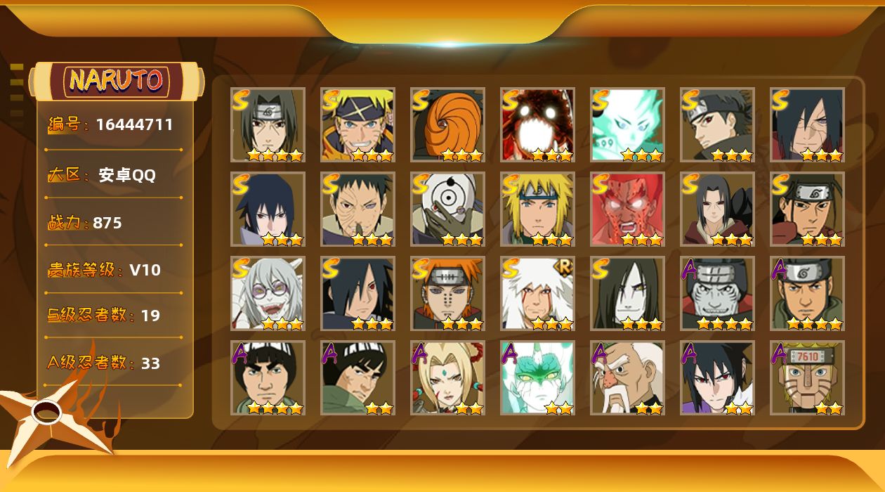 [16444711]19S级忍者数-33A级忍者数 【S级忍者】:宇智波鼬「秽土转生」(3星),宇智波斑「秽土转生·解」(3星),宇智波带土「忍界大战」(3星),宇智波鼬「须佐能乎」(4星),宇智波止水「须佐能乎」(3星),宇智波斑「木叶创立」(3星),自来也「舞之豪杰」(3星),大蛇丸(3星),千手柱间(3星),波风水门(3星),药师兜「仙人模式」(3星),迈特凯「死门」(3星),佩恩「天道」(3星),宇智波佐助「永恒万花筒」(3星),宇智波斑 「白面具」(3星宇智波斑「白面具」),大筒木舍人「最终章」(3星),漩涡鸣人「暴怒·第六尾」(3星),宇智波斑「五影会谈」(3星),漩涡鸣人·宇智波佐助(3星) 【A级忍者】:达鲁伊「博人传」(2星),迪达拉(2星),飞段(2星),飞段「死司凭血」(2星),干柿鬼鲛(4星),漩涡博人「桃式显现」(2星),机械鸣人「初始形态」(2星),迈特凯(4星),旗木卡卡西「幻之真容」(2星),桃地再不斩「漂泊武士」(2星),我爱罗「疾风传」(2星),蝎(2星),角都「秽土转生」(2星),猿飞阿斯玛(4星),宇智波止水(2星),宇智波鼬(2星),宇智波佐助「须佐能乎」(2星),宇智波佐助「万花筒写轮眼」(2星),宇智波佐助「侠隐江湖」(2星),日向宁次「忍界大战」(2星),长十郎「六代目水影」(2星),黑土「夏日限定」(2星),千手扉间「漂泊武士」(2星),秋道丁次「忍界大战」(2星),千代「近松十人卫」(2星),神农「羁绊」(2星),土台「忍界大战」(2星),不缘(2星),宇智波泉奈(2星),大野木「侠隐江湖」(2星),巳月「仙人模式」(2星),纲手「妖怪奇谭」(2星),迈特凯「青春爆炸」(2星)