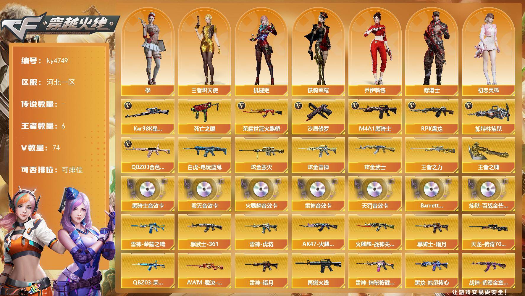 [16726356]河北一区-74V-6王者-3炫金 【热门武器】:QBZ03-金色蔷薇,死亡之眼,荣耀世冠-火麒麟,白虎-电玩蓝兔,Kar98K-星神,M4A1-黑骑士,RPK-盘龙*4,加特林-炼狱,沙鹰-修罗 【王者炫金武器】:王者之力,王者之啸,炫金雷神,炫金武士,炫金毁灭 【音效卡】:AK47-火麒麟音效卡,M4A1-雷神音效卡,M4A1-黑骑士音效卡,Barrett-毁灭音效卡,QBZ03-天罚音效卡,Barrett-碧霄极光音效卡,炼狱-百战金芒-庆典舞曲音效卡 【皮肤】:QBZ03-荣耀世冠EP 皮肤,AWM-裁决-凤灵皮肤,雷神-暗月,雷神-荣耀之魄,雷神-虎将*2,M4A1-再燃火线,雷神-神秘按键 皮肤,AK47-火麒麟-传奇EVEN,火麒麟-战神关羽,黑龙-能量核心,黑骑士-暗月*2,AK47-黑武士-361,战神-紫绶金章皮肤*3,AWM-天龙-传奇70KG,修罗-能量核心,屠龙-巅峰荣耀 皮肤,轻型军用手斧-再燃火线 【角色】:樱,机械姬,妮妮,王者炽天使,乔伊教练,修道士,初恋灵狐,卡塔琳娜,猎狐者-追月,灵狐-花神,灵狐者-黄金海岸,潘多拉-X,潘多拉-甜心教官,铁骑荣耀,影武者-X 【人偶武器】:AWM-灵狐-15周年嘉年华,迷你波特博士*2,迷你火种,迷你生化手雷*3,生化手雷-机甲核心 【暴走生化】:异变清道夫,KAC-狂怒咆哮,黑龙吞噬者,双面神,死亡之眼 【挑战大师】:激光毁灭者III,机甲撕裂者III 【英雄级武器】:AK47-火麒麟,M4A1-黑龙,M4A1-雷神*2,M4A1-黑骑士,AK47-黑武士,AK47-黑鲨,M4A1-龙血,QBZ03-天罚,QBZ03-独角-III,QBZ03-金色蔷薇,烈火-动感闪耀,王者之心-觉醒版,王者之戮-觉醒版,AK-47-猩红传说*3,白虎-电玩蓝兔,荣耀世冠-火麒麟,Barrett-毁灭,AWM-裁决,Kar98K-星神,VSK-94-金蚀,RPK-盘龙*4,加特林-炼狱,炼狱-百战金芒,炼狱-悦蓝-觉醒版,AA-12-雷霆,沙鹰-修罗,沙鹰-天神,柯尔特-荣耀世冠EP,天神-动感闪耀,屠龙,龙啸*4,麒麟刺-堕天神,马来剑-夜魔,擎天,麒麟刺,屠龙-动感闪耀,麒麟刺-百战金芒,丛林匕首-玄豹,高爆手雷-雷霆,高爆手雷-堕天神,高爆手雷-夜魔,手雷-动感闪耀,高爆手雷-玄豹,闪光弹-雷霆,闪光弹