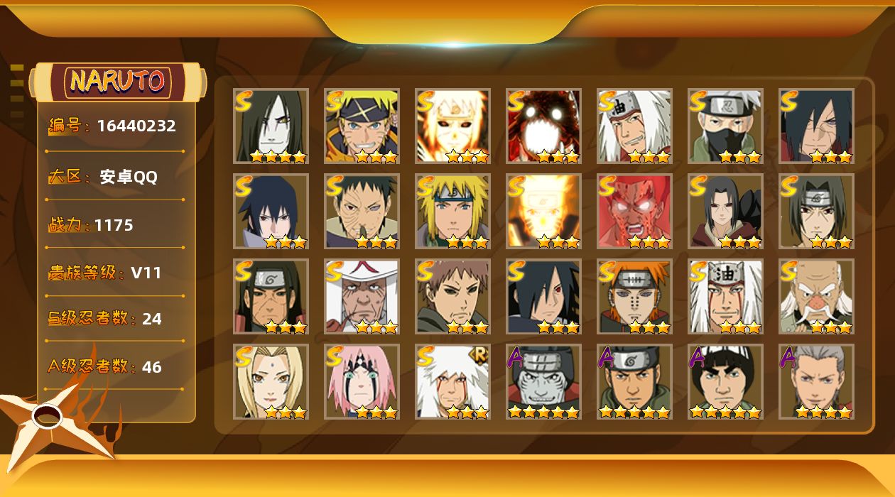 [16440232]24S级忍者数-46A级忍者数 【S级忍者】:千手柱间「秽土转生」(3星),宇智波鼬「秽土转生」(3星),宇智波斑「秽土转生·解」(3星),大野木「忍界大战」(3星),春野樱「忍界大战」(3星),宇智波带土「忍界大战」(3星),宇智波鼬「须佐能乎」(3星),旗木卡卡西「须佐能乎」(3星),宇智波斑「木叶创立」(3星),罗砂「四代目风影」(3星),自来也(3星),自来也「舞之豪杰」(3星),大蛇丸(4星),自来也「传说中的三忍」(3星),纲手(3星),猿飞日斩(3星),波风水门(3星),漩涡鸣人「九喇嘛连结」(3星),迈特凯「死门」(3星),佩恩「天道」(3星),宇智波佐助「永恒万花筒」(3星),漩涡鸣人「暴怒·第六尾」(3星),波风水门「九喇嘛连结」(3星),漩涡鸣人·宇智波佐助(3星) 【A级忍者】:艾「青年」(2星),长门「青年」(2星),波风水门「青年」(2星),波风水门「新春限定」(2星),达鲁伊「博人传」(2星),迪达拉(2星),奇拉比(2星),奇拉比「忍界大战」(2星),飞段(4星),飞段「死司凭血」(3星),干柿鬼鲛(5星),漩涡博人「桃式显现」(2星),漩涡鸣人「仙人模式」(2星),漩涡鸣人「九尾查克拉」(2星),机械鸣人「初始形态」(2星),迈特凯(5星),旗木卡卡西「幻之真容」(2星),桃地再不斩「秽土转生」(2星),我爱罗「疾风传」(4星),我爱罗「忍界大战」(2星),蝎(3星),蝎「绯流琥」(2星),小南(2星),角都「秽土转生」(2星),猿飞阿斯玛(5星),猿飞阿斯玛「秽土转生」(2星),宇智波止水(2星),宇智波鼬(2星),宇智波鼬「新春限定」(2星),宇智波佐助「须佐能乎」(2星),宇智波佐助「万花筒写轮眼」(2星),药师兜「半蛇斗篷」(2星),照美冥「夏日泳装」(2星),日向宁次「忍界大战」(2星),长十郎「六代目水影」(2星),李洛克「忍界大战」(2星),黑土「博人传」(2星),千手扉间「漂泊武士」(2星),秋道丁次「忍界大战」(2星),千代「近松十人卫」(2星),神农「羁绊」(2星),土台「忍界大战」(2星),宇智波泉奈(2星),巳月「仙人模式」(2星),纲手「妖怪奇谭」(2星),迈特凯「青春爆炸」(2星)
