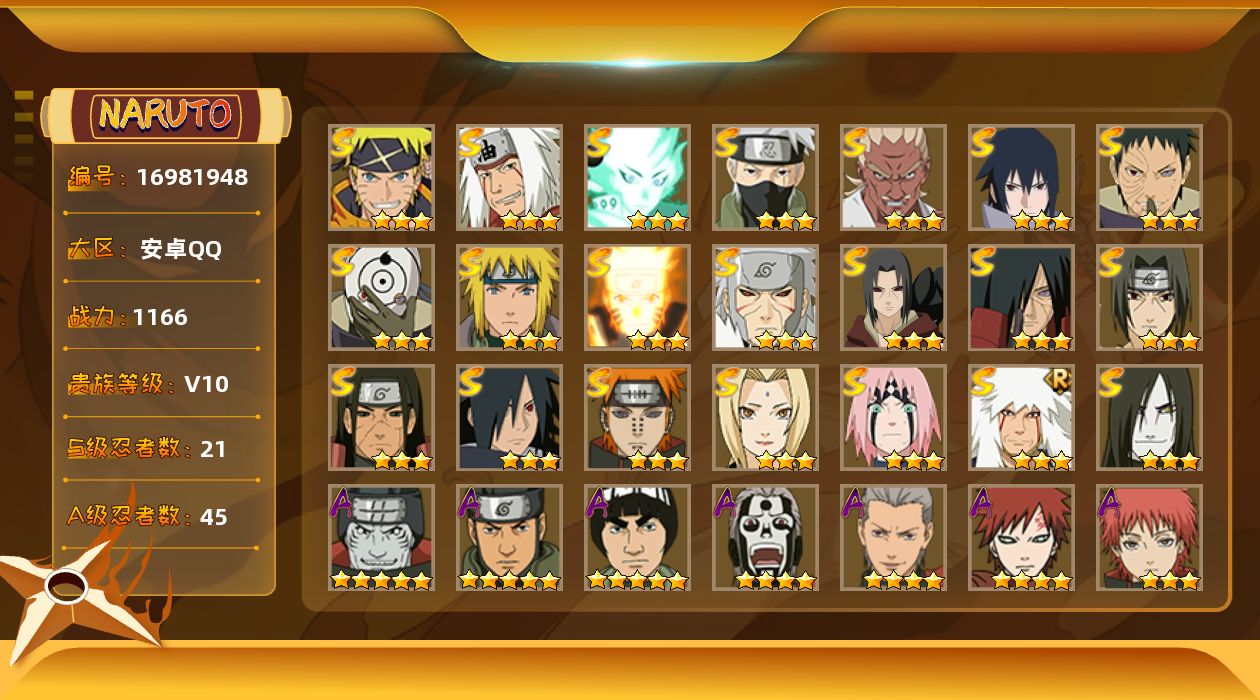 【S级忍者】:千手扉间「秽土转生」(3星),千手柱间「秽土转生」(3星),宇智波鼬「秽土转生」(3星),宇智波斑「秽土转生」(3星),春野樱「忍界大战」(3星),宇智波带土「忍界大战」(3星),艾「忍界大战」(3星),宇智波鼬「须佐能乎」(3星),旗木卡卡西「须佐能乎」(3星),宇智波斑「木叶创立」(3星),自来也「舞之豪杰」(3星),大蛇丸(3星),自来也「传说中的三忍」(3星),纲手(3星),波风水门(3星),漩涡鸣人「九喇嘛连结」(3星),佩恩「天道」(3星),宇智波佐助「永恒万花筒」(3星),宇智波斑 「白面具」(3星宇智波斑「白面具」),大筒木舍人「最终章」(3星),漩涡鸣人·宇智波佐助(3星)