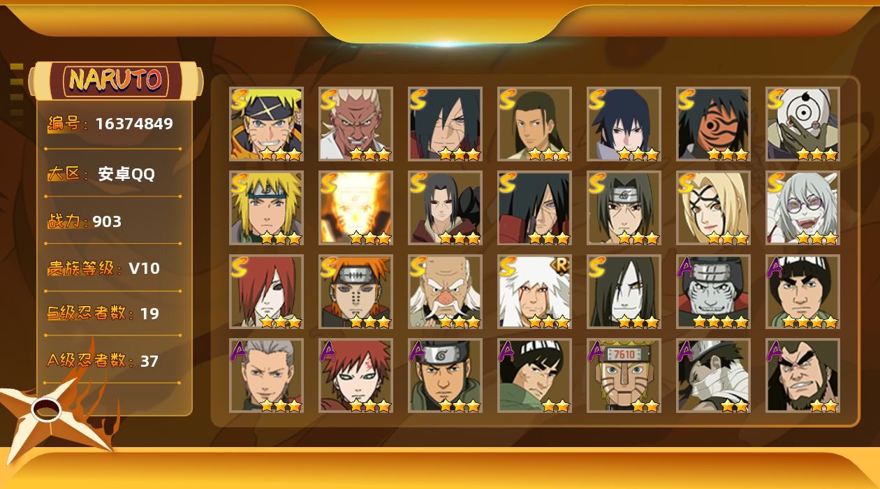 [16374849]19S级忍者数-37A级忍者数 【S级忍者】:长门「秽土转生」(3星),宇智波鼬「秽土转生」(3星),宇智波斑「秽土转生」(3星),宇智波斑「秽土转生·解」(3星),大野木「忍界大战」(3星),艾「忍界大战」(3星),宇智波鼬「须佐能乎」(3星),千手柱间「木叶创立」(3星),自来也「舞之豪杰」(3星),大蛇丸(3星),纲手「百豪」(3星),波风水门(3星),药师兜「仙人模式」(3星),神秘面具男「红夜之刃」(3星),漩涡鸣人「九喇嘛连结」(3星),佩恩「天道」(3星),宇智波佐助「永恒万花筒」(3星),宇智波斑 「白面具」(3星宇智波斑「白面具」),漩涡鸣人·宇智波佐助(3星) 【A级忍者】:长门「青年」(2星),波风水门「青年」(2星),达鲁伊「博人传」(2星),迪达拉(2星),迪达拉「秽土转生」(2星),大蛇丸「晓」(2星),奇拉比(2星),奇拉比「忍界大战」(2星),飞段(3星),飞段「死司凭血」(2星),干柿鬼鲛(4星),漩涡博人「桃式显现」(2星),漩涡鸣人「仙人模式」(2星),机械鸣人「初始形态」(2星),迈特凯(4星),旗木卡卡西「幻之真容」(2星),桃地再不斩「秽土转生」(2星),我爱罗「疾风传」(3星),蝎(2星),小南「漂泊浪客」(2星),猿飞阿斯玛(3星),宇智波佐助「须佐能乎」(2星),宇智波佐助「疾风传咒印」(2星),宇智波佐助「万花筒写轮眼」(2星),药师兜「半蛇斗篷」(2星),照美冥「五代目水影」(2星),日向宁次「忍界大战」(2星),长十郎「六代目水影」(2星),佩恩·六道「漂泊浪客」(2星),李洛克「忍界大战」(2星),黑土「博人传」(2星),秋道丁次「忍界大战」(2星),千代「近松十人卫」(2星),神农「羁绊」(2星),不缘(2星),宇智波泉奈(2星),迈特凯「青春爆炸」(2星)