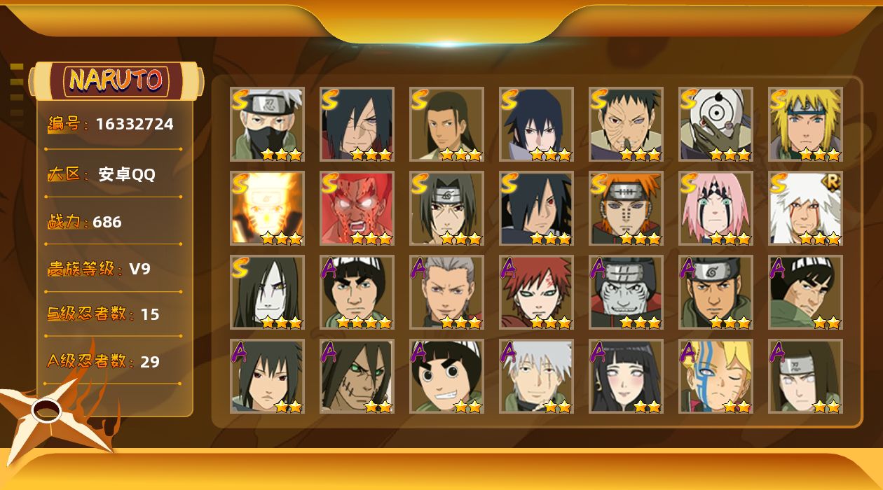 [16332724]15S级忍者数-29A级忍者数 【S级忍者】:宇智波斑「秽土转生·解」(3星),春野樱「忍界大战」(3星),宇智波带土「忍界大战」(3星),宇智波鼬「须佐能乎」(3星),旗木卡卡西「须佐能乎」(3星),宇智波斑「木叶创立」(3星),千手柱间「木叶创立」(3星),自来也「舞之豪杰」(3星),大蛇丸(3星),波风水门(3星),漩涡鸣人「九喇嘛连结」(3星),迈特凯「死门」(3星),佩恩「天道」(3星),宇智波佐助「永恒万花筒」(3星),宇智波斑 「白面具」(3星宇智波斑「白面具」) 【A级忍者】:艾「青年」(2星),长门「青年」(2星),波风水门「青年」(2星),达鲁伊「博人传」(2星),迪达拉「秽土转生」(2星),奇拉比(2星),飞段(3星),飞段「死司凭血」(2星),干柿鬼鲛(3星),漩涡博人「桃式显现」(2星),漩涡鸣人「九尾查克拉」(2星),迈特凯(4星),旗木卡卡西「幻之真容」(2星),我爱罗「疾风传」(3星),蝎(2星),角都「秽土转生」(2星),猿飞阿斯玛(3星),宇智波鼬(2星),宇智波佐助「须佐能乎」(2星),宇智波佐助「万花筒写轮眼」(2星),日向宁次「忍界大战」(2星),日向雏田「最终章」(2星),长十郎「六代目水影」(2星),神秘面具男「忍者之路」(2星),李洛克「忍界大战」(2星),秋道丁次「忍界大战」(2星),千代「近松十人卫」(2星),宇智波泉奈(2星),迈特凯「青春爆炸」(2星)
