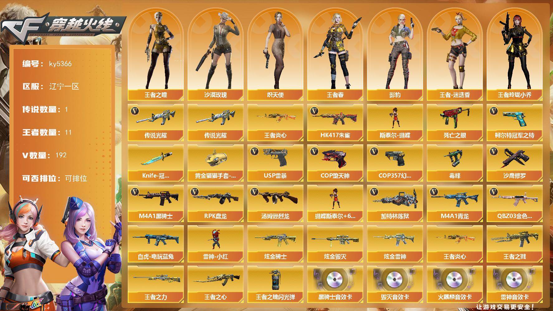 [16883106]辽宁一区-198V-11王者武器数-11炫金武器数 【传说武器】:传说光耀 【热门武器】:传说光耀,QBZ03-金色蔷薇,HK417-朱雀,M4A1-青龙,死亡之眼,白虎-电玩蓝兔,柯尔特-冠军之特*2,王者炎心,毒蜂,M4A1-黑骑士*3,汤姆逊-烈龙*6,RPK-盘龙*2,加特林-炼狱*3,斯泰尔-蝴蝶,雷神-小红,USP-雷暴*2,COP-堕天神,COP 357-幻灵,沙鹰-修罗*9,Knife-冠军之刃,黄金猫猫手套-白鲨 【王者炫金武器】:王者炎心,王者之戮,王者之心,王者之力,炫金骑士*4,炫金雷神*6,炫金毁灭,王者之魄闪光弹 【音效卡】:AK47-火麒麟音效卡,M4A1-雷神音效卡,M4A1-黑骑士音效卡,Barrett-毁灭音效卡 【皮肤】:QBZ03-冠军之薇,裁决-流光秘银,雷神-暗月,雷神-能量核心,雷神-荣耀之魄,雷神-星空*2,M4A1-雷神-CFS 2019,雷神-冠军之魄,雷神-传奇N9,火麒麟-雷神*2,火麒麟-冠军之心,火麒麟-华夏之心,AK47-火麒麟-传奇EVEN,火麒麟-平天大圣,火麒麟-心动糖果,毁灭-荣耀之怒,毁灭-黑大圣皮肤,毁灭-魔灵皮肤,毁灭-直播专属,M4A1-千变-孔明皮肤,黑龙-能量核心*2,黑龙-冠军之武,黑骑士耀金皮肤,黑骑士-冠军之势,战神-粉色甜心皮肤*2,战神-紫绶金章皮肤*6,战神-流金岁月皮肤*3,AK47-B-常胜将军-曹操,AK47-B-常胜将军-刘备*2,AK47-B-常胜将军-孙权*2,天龙-能量核心,AWM-天龙-传奇白鲨,炼狱-玩具枪皮肤,修罗-能量核心,屠龙-荣耀之锋,擎天-冠军之击 【角色】:零,樱,沙漠玫瑰,影豹,月兔特工,王者之瞳,王者春,王者-迷迭香,王者玲珑-小乔,乔伊教练,炽天使,初恋灵狐,芳心审判者,风暴女,嘉年华灵狐,娟娟,兰-海滩派对,零-水下丽影,灵狐者-X,灵狐者-黄金海岸,曼陀罗-礼服,萌儿,潘多拉-X,潘多拉-甜心教官,斯沃特-X,铁骑荣耀,兔囡囡,夜玫瑰-幻能朋克,影武者-X,职业选手,雅典娜 【人偶武器】:雷神-小红,斯泰尔-蝴蝶,AWM-灵狐-15周年嘉年华,迷你深渊冰龙*6,迷你裂空之翼,迷你牛魔王,迷你波特博士,夺魂*3,迷你牛牛,迷你生化手雷*5,深渊终结者手雷*4,闪光弹-小乔,闪光弹-貂蝉,高爆手雷-大乔,迷你艾比,迷你超能女侍,迷你巨石