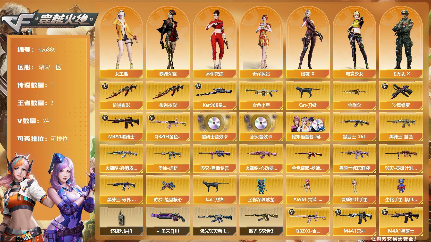 [16883747]湖南一区-23V-2王者武器数-0炫金武器数 【传说武器】:传说夜影 【热门武器】:传说夜影,QBZ03-金色蔷薇,Kar98K-星神,金色小号,Cat-刀锋,M4A1-黑骑士,沙鹰-修罗*4,金刚伞 【音效卡】:M4A1-黑骑士音效卡,Barrett-毁灭音效卡,枪娘语音包-阿敏 【皮肤】:金色蔷薇-枪娘阿敏 皮肤,雷神-虎将,火麒麟-轻羽皮肤,火麒麟-心动糖果,毁灭-直播专属,毁灭-英雄计划 皮肤,黑骑士耀金皮肤,M4A1-黑骑士-娜塔莉娅 皮肤,黑骑士-破界 皮肤,AK47-黑武士-361,修罗-能量核心 【角色】:奇洋探员,乔伊教练,暗夜-X,电竞少女,飞虎队-X,风暴女,虎妞,嘉年华灵狐,娟娟,0号玩家,龙儿,麻雀,萌儿,女主播,潘多拉-X,蛇姬,斯沃特-X,铁骑荣耀,新娜塔莎,雪莉杨,游珑儿 【人偶武器】:AWM-灵狐-15周年嘉年华,Cat-刀锋,迷你深渊冰龙,生化手雷-机甲核心,灵狐娃娃手雷 【暴走生化】:超级对讲机 【挑战大师】:激光毁灭者III-白马银枪,激光毁灭者III,神圣爆裂者-末日III 【英雄级武器】:M4A1-雷神,M4A1-黑骑士,QBZ03-天罚,无影-神兵利器,黑武士-锦绣游龙,超新星-热带奇洋,QBZ03-金色蔷薇,烈火-动感闪耀,Barrett-毁灭,Kar98K-星神,王者之怒-觉醒版,王者之力-觉醒版,沙鹰-修罗*4,沙鹰-天神,天神-动感闪耀,屠龙,屠龙-动感闪耀,龙啸-热带奇洋,手雷-动感闪耀,手雷-热带奇洋,闪光弹-神工天巧 【道具】:全能枪王背包,奇洋探员-海龟背包,炫彩背包,热带奇洋炫彩背包,超级背包,哔哩哔哩名片,绿色巨人,灵魂忍者,迷雾幽灵,生化弹匣,夺命之镰,防化服*3,金色流光-枪王排位*2,星辰流光-枪王排位,枪王排位28赛季金色流光,热带奇洋表情,斯沃特表情,动感闪耀表情,EP战队击杀图标,防弹头盔*6,防弹衣*6,C4工具钳*6,手雷包*6 【特殊枪械】:1黑骑士