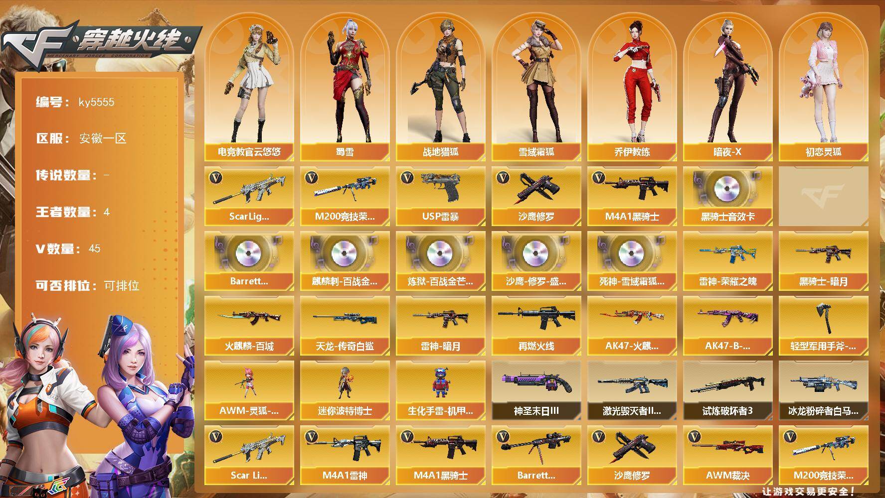 [16909938]安徽一区-46V-4王者武器数-0炫金武器数 【热门武器】:Scar Light-白虎,M200-竞技荣光,M4A1-黑骑士,USP-雷暴,沙鹰-修罗 【音效卡】:M4A1-黑骑士音效卡,沙鹰-修罗-盛典舞曲音效卡*2,Barrett-碧霄极光音效卡,麒麟刺-百战金芒-盛典舞曲音效卡,炼狱-百战金芒-庆典舞曲音效卡,死神-雪域霜狐-怀旧音效卡 【皮肤】:雷神-暗月,雷神-荣耀之魄,M4A1-再燃火线,火麒麟-百城,AK47-火麒麟-百城23冠军皮肤,黑骑士-暗月,AK47-B-常胜将军-曹操,AWM-天龙-传奇白鲨,轻型军用手斧-再燃火线 【角色】:电竞教官-云悠悠,战地猎狐,雪域霜狐,乔伊教练,暗夜-X,初恋灵狐,风暴女,嘉年华灵狐,灵狐者-X,龙儿-小淘气,曼陀罗-X,潘多拉-X,潘多拉-甜心教官,斯沃特-X,蜀雪,雪莉杨-摸金校尉 【人偶武器】:AWM-灵狐-15周年嘉年华*2,迷你波特博士*2,生化手雷-机甲核心 【挑战大师】:冰龙粉碎者-白马银枪,激光毁灭者III-白马银枪*2,试炼破坏者III,神圣爆裂者-末日III 【英雄级武器】:M4A1-雷神,M4A1-黑骑士,Scar Light-白虎,无影-神兵利器,死神-雪域霜狐,烈火-动感闪耀,王者之心-觉醒版,Barrett-毁灭,AWM-裁决,M200-竞技荣光,王者星神-觉醒版,炼狱-百战金芒,沙鹰-修罗,USP-雷暴,柯尔特-竞技荣光,天神-动感闪耀,擎天-竞技荣光*2,屠龙-动感闪耀,麒麟刺-百战金芒,高爆手雷-竞技荣光*2,手雷-动感闪耀*2,闪光弹-竞技荣光*6,烟雾弹-竞技荣光*6,M4A1-赤狱骑士,M4A1-苍鸣雷神,AWM-昌龙,Barrett-碧霄极光 【道具】:BS战队炫彩背包,CFS限定背包,云山科技背包,全能枪王背包,炫彩背包,百战金芒炫彩背包,虎牙炫彩背包,超级背包,雪域霜狐炫彩背包,哔哩哔哩名片,女皇终结者-魔龙之吻,救世主-黑桃战神,绿色巨人,灵魂忍者,变异宝贝,妖姬,迷雾幽灵,夺命之镰,防化服*3,星辰流光-枪王排位,流光-再燃火线,枪王排位29赛季金色流光,语音特效-盛典烟火,语音特效-怀旧,雪域霜狐表情,萌萌小葵表情,电玩兔兔表情*2,动感闪耀表情,EP战队名片,C4-再燃火线,防弹头盔*4,防弹衣*4,C4工具钳*4,手雷包*4 【特殊枪械】:1白虎,1黑骑士
