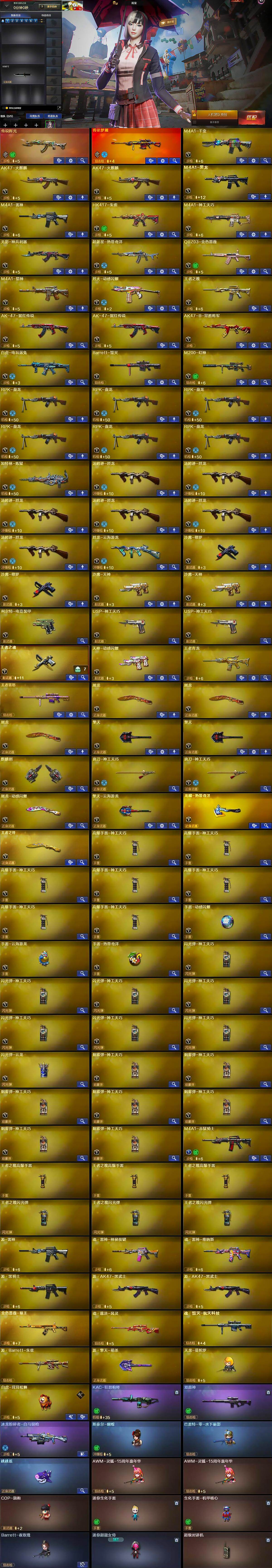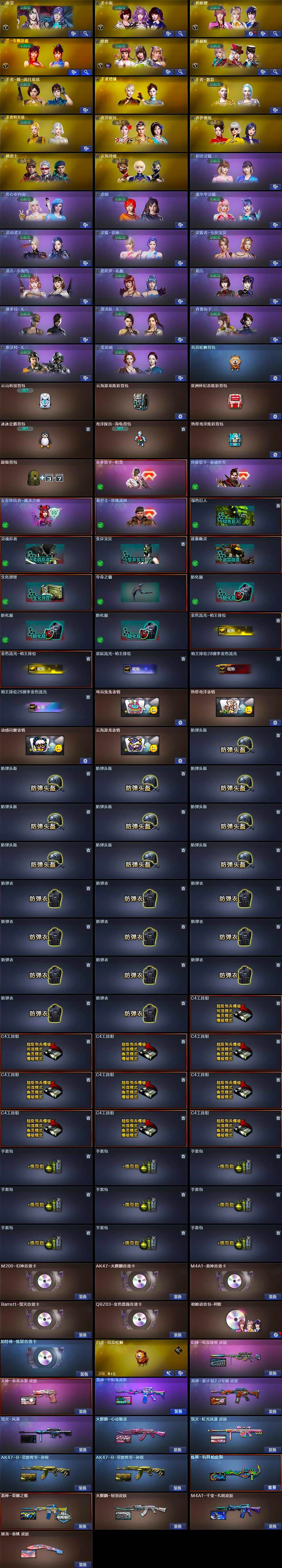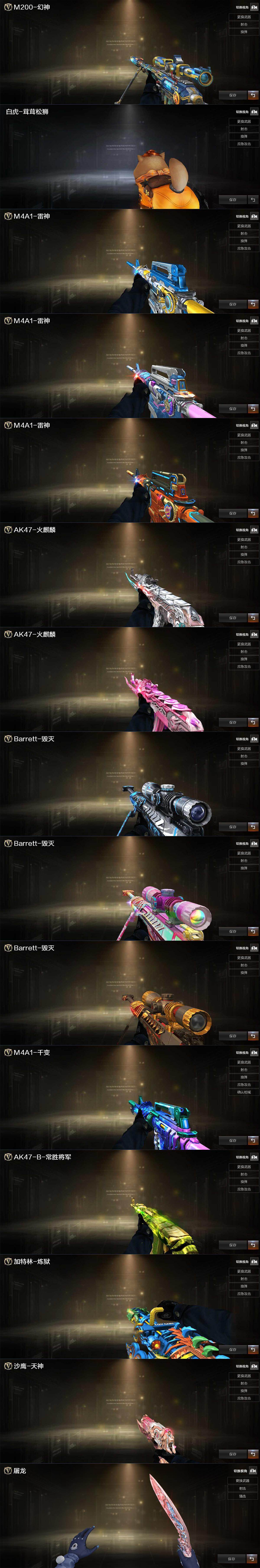 【英雄级武器】:M4A1-千变,AK47-火麒麟*2,M4A1-黑龙,M4A1-雷神,HK417-朱雀,M4A1-神工天巧,无影-神兵利器,超新星-热带奇洋,QBZ03-金色蔷薇,M4A1-猎神,烈火-动感闪耀,王者之魄-觉醒版,AK-47-猩红传说*2,AK47-B-常胜将军,白虎-电玩蓝兔,Barrett-毁灭,M200-幻神,RPK-盘龙*6,加特林-炼狱,汤姆逊-烈龙*6,烈龙-云海游龙,沙鹰-修罗*2,沙鹰-天神*2,柯尔特-电竞装甲,USP-神工天巧*2,王者之魂-觉醒版,天神-动感闪耀,屠龙*3,擎天*2,