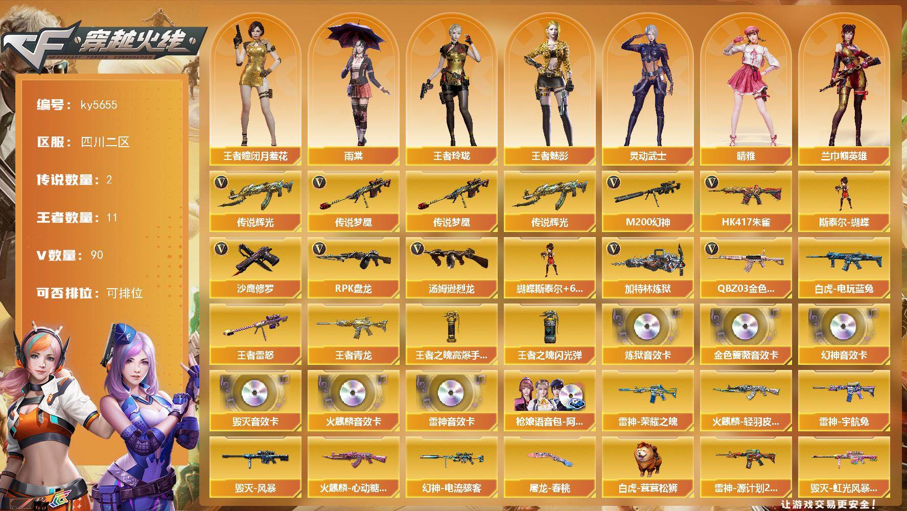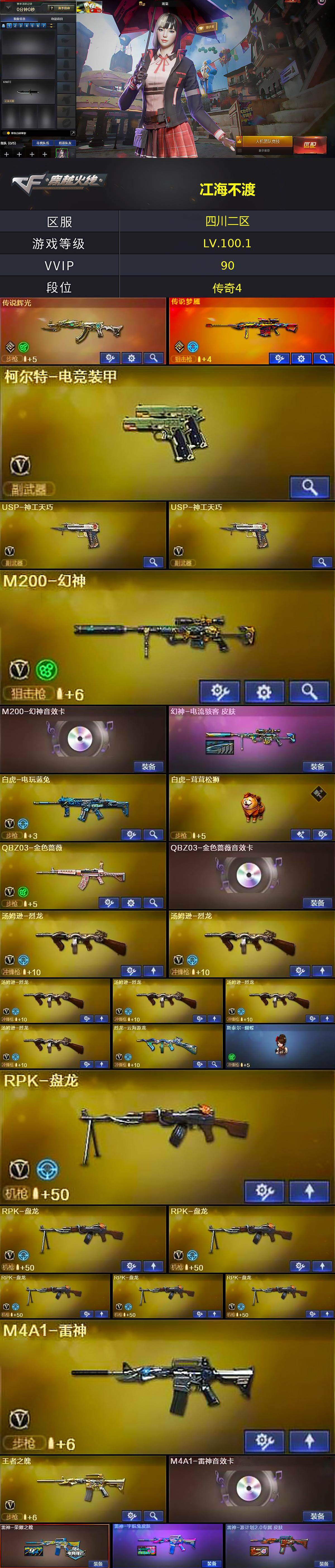 [16915311]四川二区-91V-11王者武器数-0炫金武器数 【传说武器】:传说辉光,传说梦魇 【热门武器】:传说梦魇,传说辉光,QBZ03-金色蔷薇,HK417-朱雀,M200-幻神,白虎-电玩蓝兔,汤姆逊-烈龙*6,RPK-盘龙*6,加特林-炼狱,斯泰尔-蝴蝶,沙鹰-修罗*2 【王者炫金武器】:王者青龙,王者雷怒,王者之魄高爆手雷*3,王者之魄闪光弹*3 【音效卡】:M200-幻神音效卡,AK47-火麒麟音效卡,M4A1-雷神音效卡,Barrett-毁灭音效卡,QBZ03-金色蔷薇音效卡,枪娘语音包-阿敏,加特林-炼狱音效卡 【皮肤】:幻神-电流骇客 皮肤,白虎-茸茸松狮,雷神-荣耀之魄,雷神-宇航兔皮肤,雷神-源计划2.0专属 皮肤,火麒麟-轻羽皮肤,火麒麟-心动糖果,毁灭-风暴,毁灭-虹光风暴 皮肤,毁灭-英雄计划 皮肤,M4A1-千变-孔明皮肤,AK47-B-常胜将军-孙权*2,炼狱-玩具枪皮肤,天神-春花弄影 皮肤,屠龙-春桃 皮肤 【角色】:雨棠,关小雨,枪娘樱,兰-巾帼英雄,晴雅,机械姬,王者-瞳-闭月羞花,王者玲珑,王者-魅影,王者炽天使,奇洋探员,乔伊教练,修道士,云海玲珑,初恋灵狐,芳心审判者,虎妞,嘉年华灵狐,兰-新年限定,灵动武士,灵狐-花神,灵狐者-七夕宝贝,龙儿-小淘气,曼陀罗-礼服,萌儿,潘多拉-X,潜龙队-X,青霞仙子,斯沃特-X,兔囡囡,雪莉杨,智影 【人偶武器】:天龙-曼陀罗,斯泰尔-蝴蝶,巴雷特-零-水下丽影,跳跳鲨,AWM-灵狐-15周年嘉年华*2,COP-旗袍,迷你生化手雷,生化手雷-机甲核心,Barrett-夜玫瑰,迷你超能女侍 【暴走生化】:KAC-狂怒咆哮,双面神,超级对讲机 【挑战大师】:冰龙粉碎者-白马银枪 【英雄级武器】:M4A1-千变,AK47-火麒麟*2,M4A1-黑龙,M4A1-雷神,HK417-朱雀,M4A1-神工天巧,无影-神兵利器,超新星-热带奇洋,QBZ03-金色蔷薇,M4A1-猎神,烈火-动感闪耀,王者之魄-觉醒版,AK-47-猩红传说*2,AK47-B-常胜将军,白虎-电玩蓝兔,Barrett-毁灭,M200-幻神,RPK-盘龙*6,加特林-炼狱,汤姆逊-烈龙*6,烈龙-云海游龙,沙鹰-修罗*2,沙鹰-天神*2,柯尔特-电竞装甲,USP-神工天巧*2,王者之魂-觉醒版,天神-动感闪耀,屠龙*3,擎天*2,