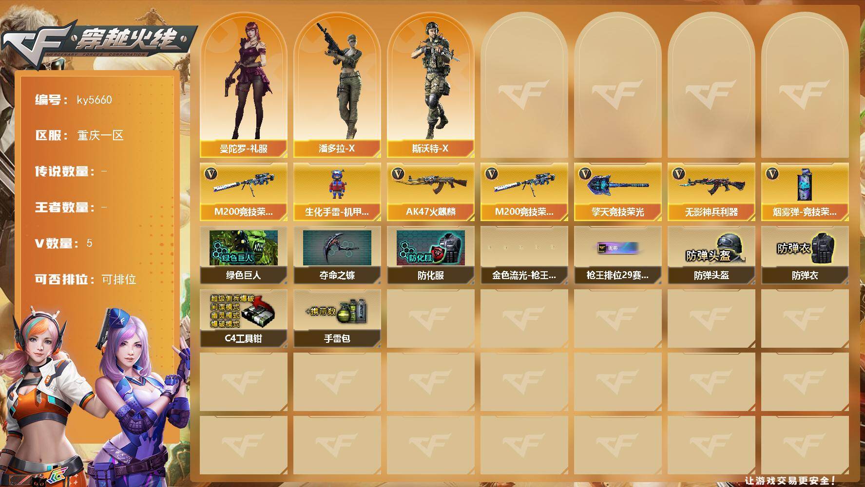 [16916787]重庆一区-5V-0王者武器数-0炫金武器数 【热门武器】:M200-竞技荣光 【角色】:曼陀罗-礼服,潘多拉-X,斯沃特-X 【人偶武器】:生化手雷-机甲核心 【英雄级武器】:AK47-火麒麟,无影-神兵利器,M200-竞技荣光,擎天-竞技荣光,烟雾弹-竞技荣光 【道具】:绿色巨人,夺命之镰,防化服*2,金色流光-枪王排位,枪王排位28赛季金色流光,枪王排位29赛季金色流光,防弹头盔*5,防弹衣*5,C4工具钳*4,手雷包*4 【特殊枪械】: