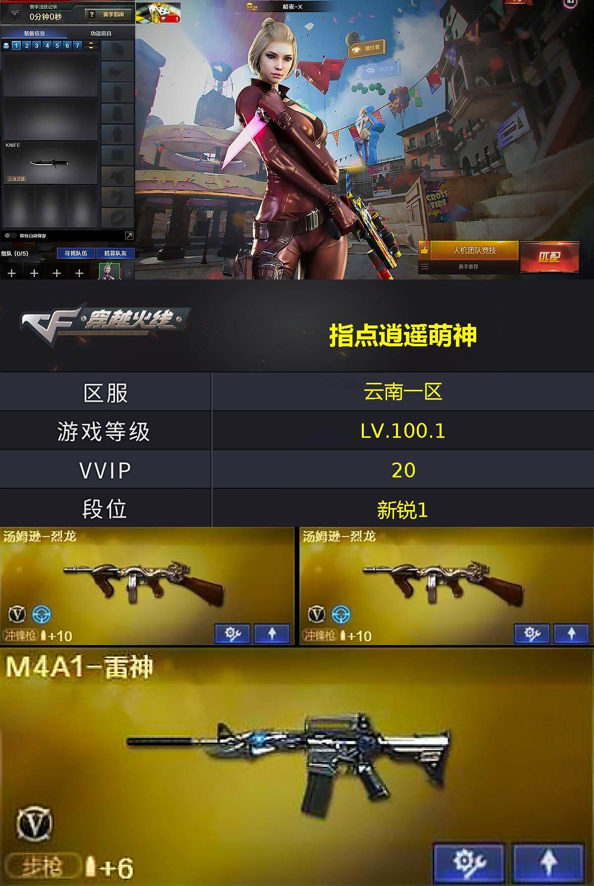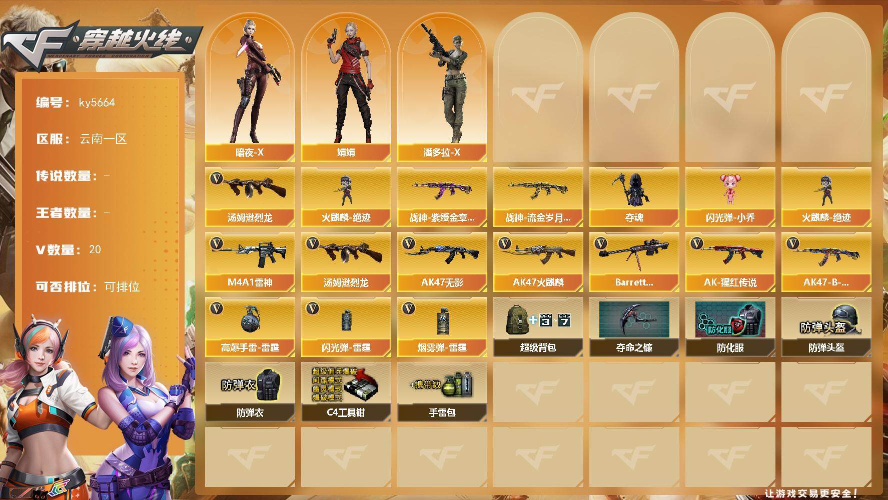 [16916725]云南一区-20V-0王者武器数-0炫金武器数 【热门武器】:汤姆逊-烈龙*2,火麒麟-绝迹 【皮肤】:战神-紫绶金章皮肤*3,战神-流金岁月皮肤*3 【角色】:暗夜-X,娟娟,潘多拉-X 【人偶武器】:火麒麟-绝迹,夺魂,闪光弹-小乔 【英雄级武器】:AK47-火麒麟,M4A1-雷神,AK47-无影,AK-47-猩红传说*7,AK47-B-战神,Barrett-毁灭,汤姆逊-烈龙*2,高爆手雷-雷霆,闪光弹-雷霆,烟雾弹-雷霆 【道具】:超级背包,夺命之镰,防化服,防弹头盔*2,防弹衣*2,C4工具钳,手雷包 【特殊枪械】:2烈龙