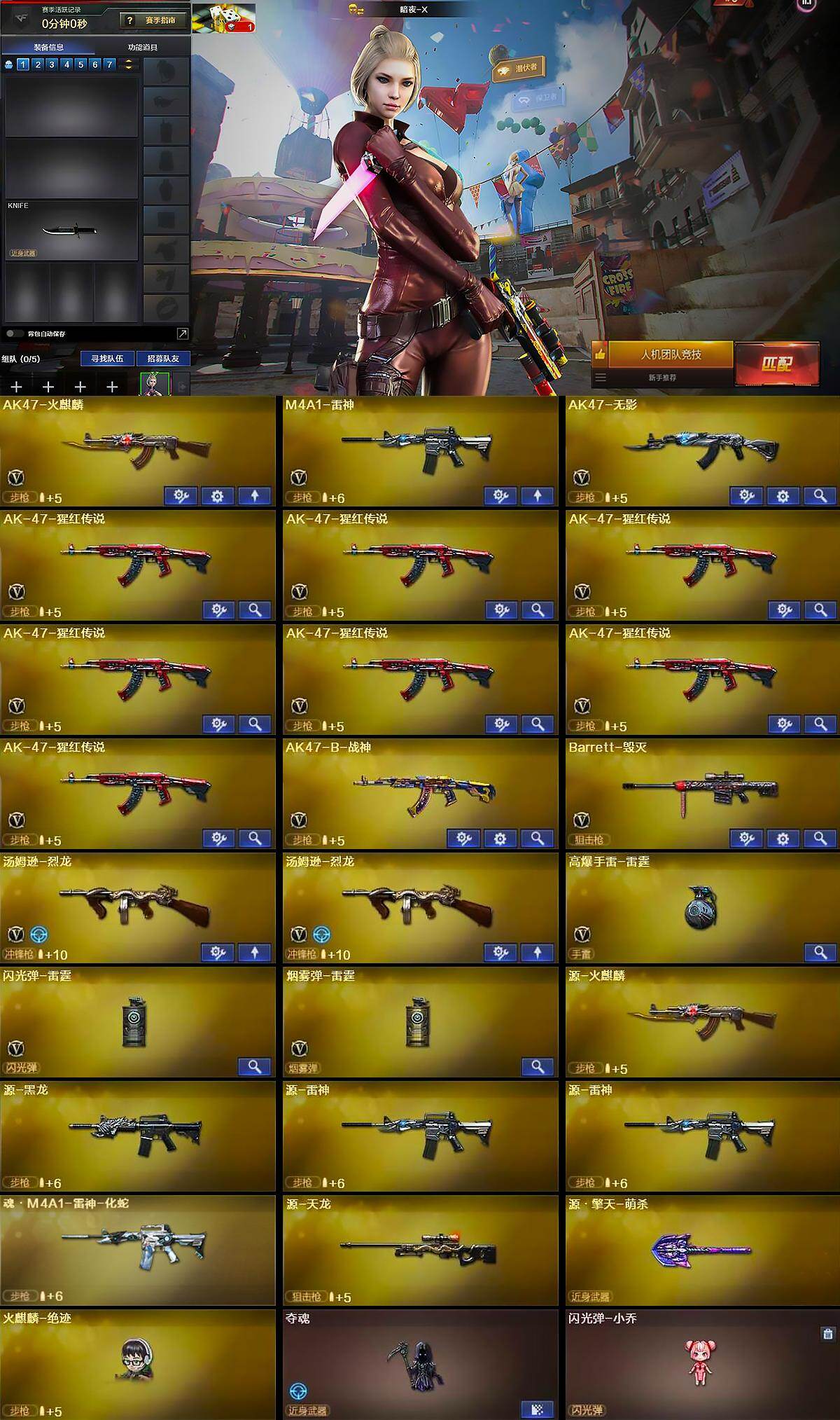 【英雄级武器】:AK47-火麒麟,M4A1-雷神,AK47-无影,AK-47-猩红传说*7,AK47-B-战神,Barrett-毁灭,汤姆逊-烈龙*2,高爆手雷-雷霆,闪光弹-雷霆,烟雾弹-雷霆