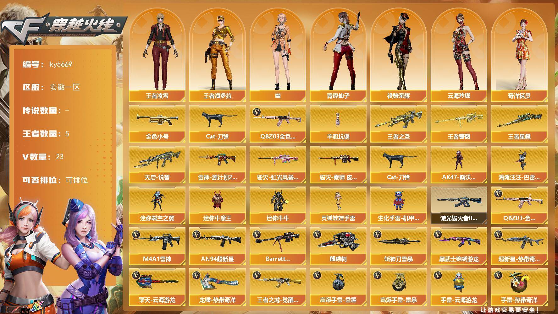 [16916620]安徽一区-21V-5王者武器数-0炫金武器数 【热门武器】:QBZ03-金色蔷薇,金色小号,Cat-刀锋,羊驼玩偶*2 【王者炫金武器】:王者之圣,天启-悦智,王者蔷薇,王者星霆 【皮肤】:雷神-源计划2.0专属 皮肤,毁灭-虹光风暴 皮肤,毁灭-秦师 皮肤 【角色】:王者凌霄,王者潘多拉,奇洋探员,云海玲珑,暗夜-X,飞虎队-X,风暴女,猎狐者-追月,0号玩家,麻雀,曼陀罗-X,曼陀罗-礼服,潘多拉-X,潜龙队-X,青霞仙子,铁骑荣耀,新娜塔莎,夜玫瑰-宠粉,幽,游珑儿 【人偶武器】:海滩汪汪-巴雷特,Cat-刀锋,迷你裂空之翼,迷你牛魔王,迷你牛牛,生化手雷-机甲核心,AK47-斯沃特,灵狐娃娃手雷*2 【挑战大师】:激光毁灭者III-白马银枪 【英雄级武器】:M4A1-雷神*2,AN94-超新星,黑武士-锦绣游龙,超新星-热带奇洋,QBZ03-金色蔷薇,王者之城-觉醒版,Barrett-毁灭,麒麟刺,擎天-云海游龙,龙啸-热带奇洋,斩神刀-雷暴,高爆手雷-雷霆,高爆手雷-雷暴,手雷-云海游龙,手雷-热带奇洋,闪光弹-雷霆,闪光弹-雷暴*2,烟雾弹-雷霆,烟雾弹-雷暴 【道具】:BS战队炫彩背包,CFS限定背包,云山科技背包,奇洋探员-海龟背包,热带奇洋炫彩背包,超级背包,女皇终结者-魔龙之吻,绿色巨人,灵魂忍者*2,变异宝贝,迷雾幽灵*2,生化弹匣,夺命之镰,防化服*3,金色流光-枪王排位,星辰流光-枪王排位,枪王排位28赛季金色流光,枪王排位29赛季金色流光,热带奇洋表情,云海游龙表情,C4-沙漠,防弹头盔*3,防弹衣*3,C4工具钳*3,手雷包*3 【特殊枪械】: