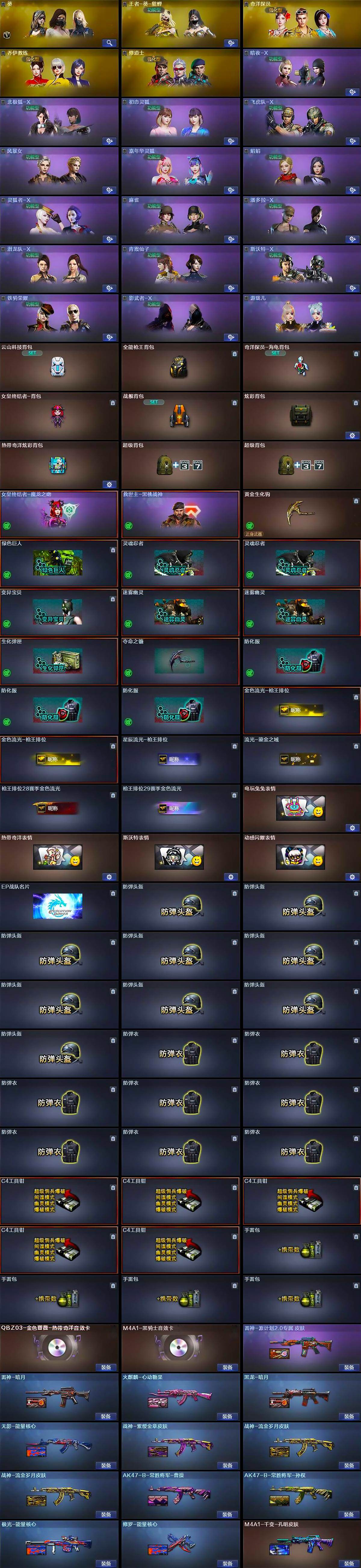 【道具】:云山科技背包,全能枪王背包,奇洋探员-海龟背包,女皇终结者-背包,战舰背包,炫彩背包,热带奇洋炫彩背包,超级背包*2,女皇终结者-魔龙之吻,救世主-黑桃战神,黄金生化钩,绿色巨人,灵魂忍者*2,变异宝贝,迷雾幽灵*2,生化弹匣,夺命之镰,防化服*3,金色流光-枪王排位*2,星辰流光-枪王排位,流光-鎏金之域,枪王排位28赛季金色流光,枪王排位29赛季金色流光,电玩兔兔表情,热带奇洋表情,斯沃特表情,动感闪耀表情,EP战队名片,防弹头盔*9,防弹衣*8,C4工具钳*5,手雷包*4