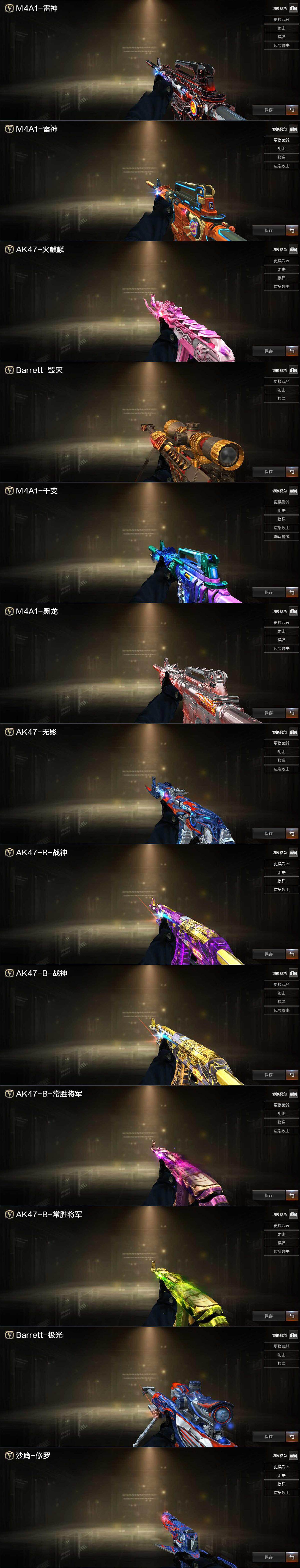 【英雄级武器】:M4A1-千变,AK47-火麒麟*3,M4A1-黑龙,M4A1-雷神*3,AK47-黑武士,M4A1-龙血,无影-神兵利器,黑武士-锦绣游龙,超新星-热带奇洋,QBZ03-金色蔷薇,AK-47-猩红传说*4,AK47-B-战神,黑骑士-海王,AK47-B-常胜将军,Barrett-毁灭,汤姆逊-烈龙*2,沙鹰-修罗*2,沙鹰-天神,屠龙,龙啸,麒麟刺*2,龙啸-热带奇洋,王者之锋-觉醒版,手雷-热带奇洋,闪光弹-竞技荣光*2,烟雾弹-竞技荣光,M4A1-赤狱骑士