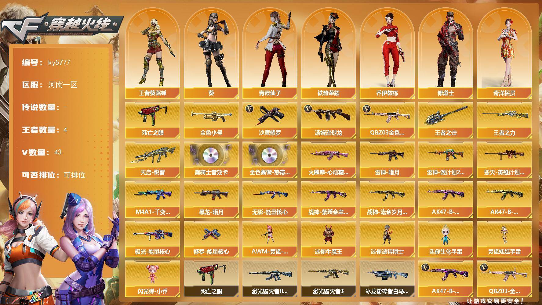 [16881336]河南一区-41V-4王者武器数-0炫金武器数 【热门武器】:QBZ03-金色蔷薇,死亡之眼,金色小号,汤姆逊-烈龙*2,沙鹰-修罗*2 【王者炫金武器】:天启-悦智,王者之力,王者之击 【音效卡】:QBZ03-金色蔷薇-热带奇洋音效卡,M4A1-黑骑士音效卡 【皮肤】:雷神-暗月,雷神-源计划2.0专属 皮肤,火麒麟-心动糖果,毁灭-英雄计划 皮肤,M4A1-千变-孔明皮肤,黑龙-暗月,无影-能量核心,战神-紫绶金章皮肤,战神-流金岁月皮肤*2,AK47-B-常胜将军-曹操,AK47-B-常胜将军-孙权,极光-能量核心,修罗-能量核心 【角色】:葵,王者-葵-貂蝉,奇洋探员,乔伊教练,修道士,暗夜-X,北极狐-X,初恋灵狐,飞虎队-X,风暴女,嘉年华灵狐,娟娟,灵狐者-X,麻雀,潘多拉-X,潜龙队-X,青霞仙子,斯沃特-X,铁骑荣耀,影武者-X,游珑儿 【人偶武器】:AWM-灵狐-15周年嘉年华*2,迷你牛魔王,迷你波特博士,迷你生化手雷,闪光弹-小乔,灵狐娃娃手雷 【暴走生化】:死亡之眼 【挑战大师】:冰龙粉碎者-白马银枪,激光毁灭者III-白马银枪,激光毁灭者III*2 【英雄级武器】:M4A1-千变,AK47-火麒麟*3,M4A1-黑龙,M4A1-雷神*3,AK47-黑武士,M4A1-龙血,无影-神兵利器,黑武士-锦绣游龙,超新星-热带奇洋,QBZ03-金色蔷薇,AK-47-猩红传说*4,AK47-B-战神,黑骑士-海王,AK47-B-常胜将军,Barrett-毁灭,汤姆逊-烈龙*2,沙鹰-修罗*2,沙鹰-天神,屠龙,龙啸,麒麟刺*2,龙啸-热带奇洋,王者之锋-觉醒版,手雷-热带奇洋,闪光弹-竞技荣光*2,烟雾弹-竞技荣光,M4A1-赤狱骑士 【道具】:云山科技背包,全能枪王背包,奇洋探员-海龟背包,女皇终结者-背包,战舰背包,炫彩背包,热带奇洋炫彩背包,超级背包*2,女皇终结者-魔龙之吻,救世主-黑桃战神,黄金生化钩,绿色巨人,灵魂忍者*2,变异宝贝,迷雾幽灵*2,生化弹匣,夺命之镰,防化服*3,金色流光-枪王排位*2,星辰流光-枪王排位,流光-鎏金之域,枪王排位28赛季金色流光,枪王排位29赛季金色流光,电玩兔兔表情,热带奇洋表情,斯沃特表情,动感闪耀表情,EP战队名片,防弹头盔*9,防弹衣*8,C4工具钳*5,手雷包*4 【特殊枪械】:2烈龙