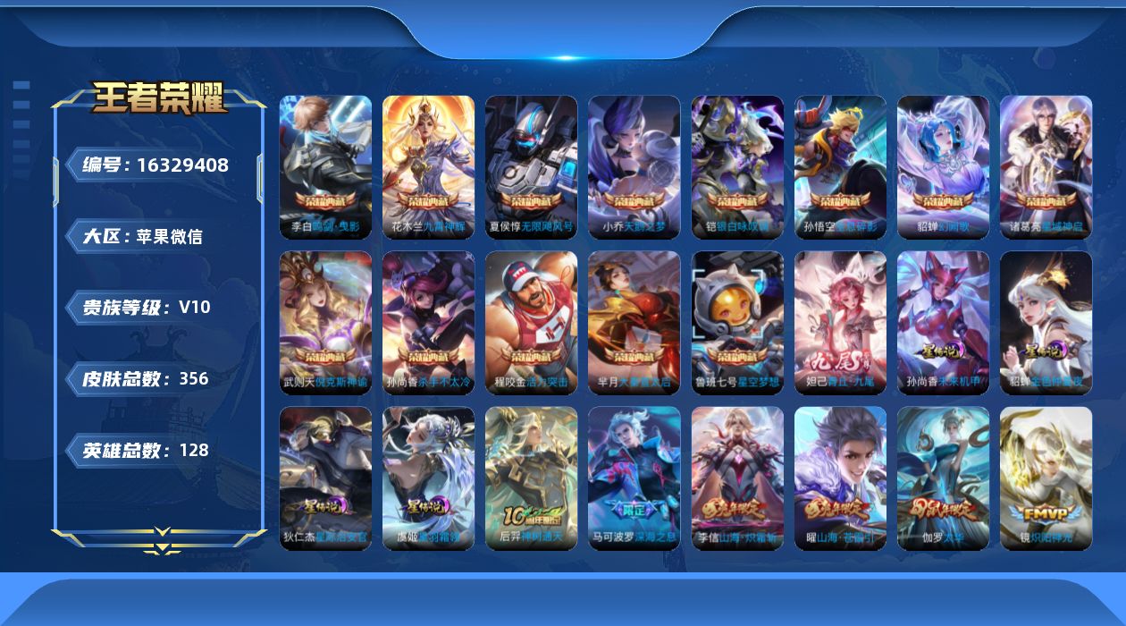 [16329408]社交限制介意勿拍!苹果WX-V10-至尊星耀V段位-128英雄-356皮肤-13典藏皮肤-1典藏英雄-1无双-42传说-108史诗-4星传说(未来机甲,星际治安官,金色仲夏夜,黛羽霜翎)