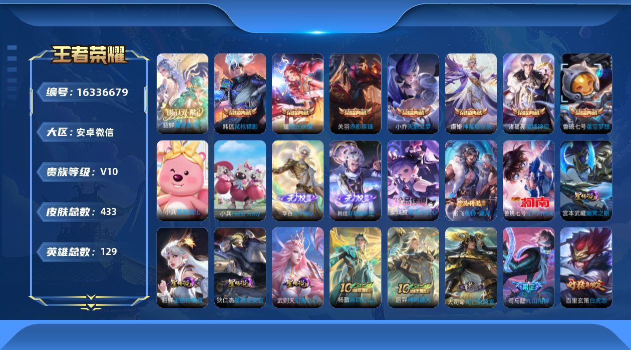 [16336679]安卓WX,hellokitty小兵!2天幕!-V10-最强王者段位-129英雄-433皮肤-7典藏皮肤-1典藏英雄-1珍品无双-2无双-3珍品传说-64传说-122史诗-4星传说! 【英雄全皮】:司马懿全皮,姜子牙全皮,孙权全皮,朵莉亚全皮,米莱狄全皮,桑启全皮,莱西奥全皮,空空儿全皮,影全皮,少司缘全皮 【荣耀典藏】:武则天英雄,小乔天鹅之梦,鲁班七号星空梦想,诸葛亮星域神启,关羽赤影疾锋,韩信弑枪猎影,虞姬神鉴启示录,瑶拾光映像 【珍品无双】:貂蝉馥梦繁花 【无双皮肤】:李白碎月剑心,韩信群星魔术团 【珍品传说】:鲁班七号江户川柯南,张飞兔狲蓬尾,安琪拉酷洛米之心 【传说皮肤】:杨戬纵目迁山,后羿神树通天,大司命死亡执政官,司马懿九山相柳,女娲愿照千秋盛,妲己愿照众生和,蔡文姬愿照福禄聚,虞姬愿照岁时盈,云缨幻光神枪,嬴政玄雷天君,王昭君映山客,桑启鸣野蒿,夏侯惇霜北刀,铠冥王哈迪斯,朵莉亚心动手记,墨子黄金天蝎座,海月金乌负日,亚连落雪白狼,吕布曦玄引,典韦战鼓燎原,孙尚香乘龙问璇玑,孙策乘龙淬吴钩,赵云乘龙铭钟鼎,澜逐花归海,艾琳觅芳踪,露娜霜月吟,孙膑小动物乐团,鲁班七号时之奇旅,宫本武藏惊梅引,马可波罗妄想实况,干将莫邪画中仙,伽罗炽翼辉光,李信山海炽霜斩,吕布怒海麟威,李白诗剑行,王昭君星穹之声,娜可露露前尘镜,马可波罗深海之息,马超无双飞将,大乔挚爱花嫁,孙策挚爱之约,蔡文姬花朝如约,孙策末日机甲,裴擒虎寅虎赤拳,赵云淬星耀世,王昭君乞巧织情,西施游龙清影,周瑜音你心动,小乔音你心动,李元芳飞鸢探春,铠绛天战甲,镜炽阳神光,虞姬启明星使,关羽武圣,曜云鹰飞将,张良黄金白羊座,达摩黄金狮子座,百里玄策白虎志,后羿黄金射手座,貂蝉仲夏夜之梦,宫本武藏地狱之眼,吕布天魔缭乱,武则天海洋之心,狄仁杰超时空战士 【限定皮肤】:白起狰,夏侯惇霜北刀,铠冥王哈迪斯,蒙犽顽岩魄,蔡文姬夏日便利店,大乔绒语心约,虞姬夏日便利店,姜子牙天穹之誓,狄仁杰阴阳师,廉颇寅虎御盾,赵云皇家上将,赵云龙胆,妲己时之奇旅,嬴政优雅恋人,鲁班七号时之奇旅,庄周高山流水,高渐离玩趣恶龙,吕布天魔缭乱,吕布御风骁将,夏侯惇朔风刀,甄姬落雪兰心,典韦岱宗,马可波罗暗影游猎,马可波罗深海之息,马可波罗山海玄木吟,马可波罗妄想实况,狄仁杰魔术师,达摩沙漠行僧,项羽海滩派对,老夫子醍醐杖,关羽
