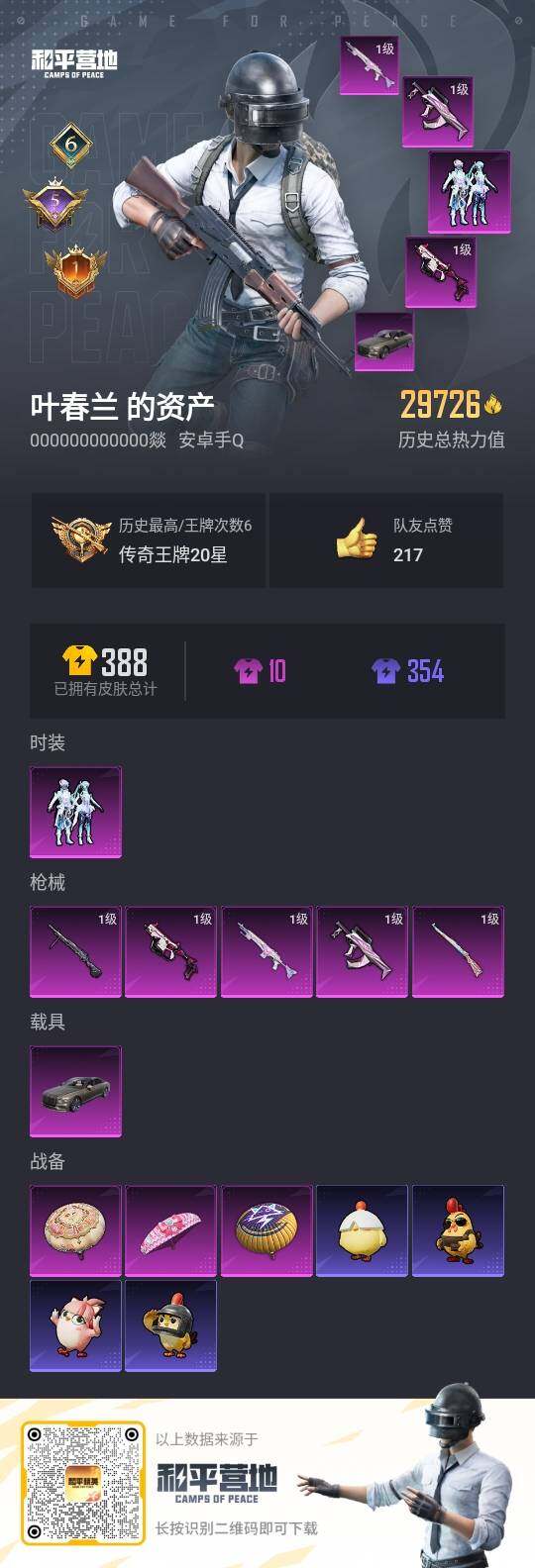 - [15650074]【店主推荐捡漏号!可直接换绑】苹果 手Q-1粉装-1特效枪-1载具-1粉色飞行器-34265热力值-5王牌印记-89套装-112枪皮【热门品类】:套装-小丑鱼,角色-军刀雅典娜,套装-龟仙人【粉色套装】:粉装-银红美神【粉色枪皮等级】:SCAR-L-纯梦嫁纱(七级)【粉色载具】:仰望U8(龙石绿)【粉色枪皮】:SCAR-L-纯梦嫁纱【粉色飞行器】:庄周梦蝶飞行器