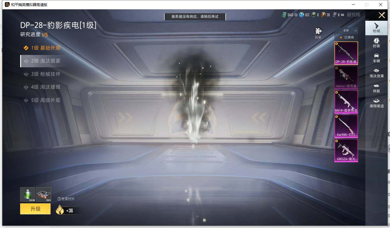 【粉色枪皮等级】:GROZA-镜光银凌(一级),Vector-绯穹魔姬(一级),Kar98K-巳巳如意(一级),Mk14-甜梦熊击(一级),DP-28-豹影疾电(一级)