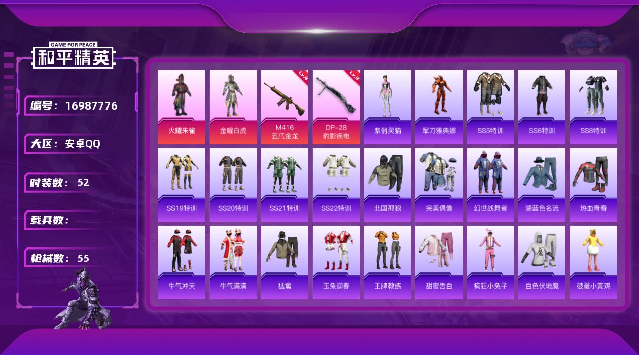 [16987776]安卓 手Q-2粉装-3特效枪-0载具-1粉色飞行器-18396热力值-1王牌印记-52套装-55枪皮 【热门品类】:角色-军刀雅典娜 【粉色套装】:粉装-火曜朱雀,粉装-金曜白虎 【粉色枪皮等级】:M416-五爪金龙(四级),DP-28-豹影疾电(三级) 【粉色枪皮】:M416-五爪金龙,Mk14-福马献瑞,DP-28-豹影疾电 【粉色降落伞】:环太平洋降落伞,彩虹甜喵降落伞,旋转彩虹降落伞 【稀有套装】:套装-雪国风尚,角色-紫俏灵猫 【稀有枪皮】:SCAR-L-炫彩节奏,SCAR-L-玉兔迎春,GROZA-影袭,AUG-耀粉歌者,QBZ-飞驰魅影,AC-VAL-天降萌叽,蜜獾-娇憨猪猪,UZI-娇憨猪猪,UZI-影袭,UMP45-蓝色火焰,Vector-生命誓言,汤姆逊-天降萌叽,汤姆逊-环太平洋,P90-飞驰魅影,Kar98K-影袭,Kar98K-王子的夏天,Kar98K-飞驰魅影,SKS-夜灯,SKS-炫彩节奏,Mini14-穿刺龙虾,SLR-娇憨猪猪,S686-红色方程式,S1897-炫彩节奏,S1897-飞驰魅影,S12K-娇憨猪猪,M249-破晓战魂,DP-28-彩虹符号,MG3-幻世战舞者,P1911-冰封烈焰 【其他套装】:套装-SS5特训,套装-SS6特训,套装-SS8特训,套装-SS19特训,套装-SS20特训,套装-SS21特训,套装-SS22特训,套装-北国孤狼,套装-完美偶像,套装-幻世战舞者,套装-湖蓝色名流,套装-热血青春,套装-牛气冲天,套装-牛气满满,套装-猛禽,套装-玉兔迎春,套装-王牌教练,套装-甜蜜告白,套装-疯狂小兔子,套装-白色伏地魔,套装-破蛋小黄鸡,套装-竞技勇士朋克,套装-竞技名士,套装-耀眼新星,套装-长空猛禽,套装-骑行爱好者,套装-魅力单车,套装-麻辣教官,套装-黄色伏地魔,套装-黄色名流,套装-黄色运动,套装-黑色伏地魔,套装-清新柠檬,套装-夜莺强袭者,套装-雪山精英,套装-精神漫游,套装-音速流光,套装-娇憨猪猪,套装-萌趣咩咩 【稀有头盔】:金曜白虎头盔(3级),金风玉露头盔(2级) 【稀有背包】:金曜白虎背包(3级),幻影战神背包(3级) 【营地ID】:926880617