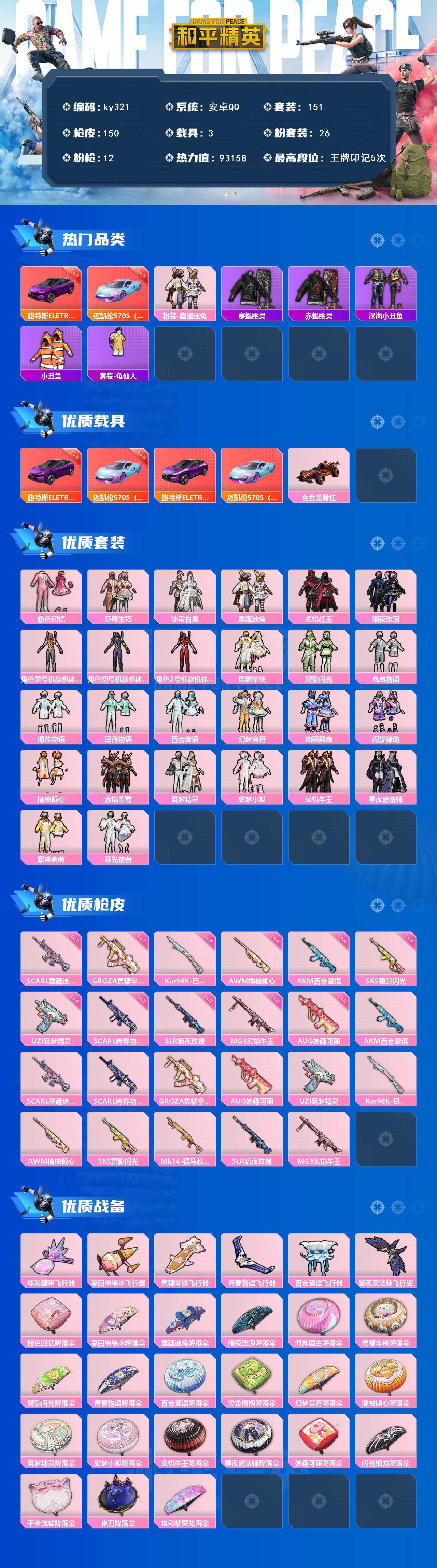 [16988718]安卓 手Q-26粉装-12特效枪-3载具-6粉色飞行器-93158热力值-5王牌印记-151套装-150枪皮 【红色载具】:路特斯ELETRE(电光紫)(五级),迈凯伦570S(炫冰蓝)(五级) 【热门品类】:粉装-童趣迷兔,套装-寒蝎幽灵,套装-赤蝎幽灵,套装-深海小丑鱼,套装-小丑鱼,套装-龟仙人 【粉色套装】:粉装-粉色回忆,粉装-草莓生巧,粉装-冰霜白皇,粉装-童趣迷兔,粉装-炙焰红王,粉装-暗夜玫瑰,角色-零号机款机体服,角色-初号机款机体服,角色-2号机款机体服,粉装-焦糖拿铁,粉装-碧影闪光,粉装-岚岚物语,粉装-海盐物语,粉装-薄荷物语,粉装-百合蜜语,粉装-幻梦音符,粉装-绚丽摇曳,粉装-闪耀律动,粉装-橘柚倾心,粉装-赤焰黑爵,粉装-筑梦精灵,粉装-甜梦小狐,粉装-炙焰牛王,粉装-星夜魔法师,粉装-暖熊萌萌,粉装-寒光使者 【粉色枪皮等级】:AKM-百合蜜语(四级),SCAR-L-童趣迷兔(七级),SCAR-L-青春物语(三级),GROZA-焦糖拿铁(七级),AUG-妙趣可丽(二级),UZI-筑梦精灵(四级),Kar98K-巳巳如意(五级),AWM-橘柚倾心(四级),SKS-碧影闪光(四级),SLR-暗夜玫瑰(二级),MG3-炙焰牛王(二级) 【粉色载具】:路特斯ELETRE(电光紫),迈凯伦570S(炫冰蓝),合金龙骨(红) 【粉色枪皮】:AKM-百合蜜语,SCAR-L-童趣迷兔,SCAR-L-青春物语,GROZA-焦糖拿铁,AUG-妙趣可丽,UZI-筑梦精灵,Kar98K-巳巳如意,AWM-橘柚倾心,SKS-碧影闪光,Mk14-福马献瑞,SLR-暗夜玫瑰,MG3-炙焰牛王 【粉色飞行器】:炫彩糖果飞行器,夏日绵绵冰飞行器,焦糖拿铁飞行器,青春物语飞行器,百合蜜语飞行器,星夜魔法师飞行翼 【粉色降落伞】:粉色回忆降落伞,夏日绵绵冰降落伞,童趣迷兔降落伞,暗夜玫瑰降落伞,海渊国主降落伞,焦糖拿铁降落伞,碧影闪光降落伞,青春物语降落伞,百合蜜语降落伞,恐龙拽拽降落伞,幻梦音符降落伞,橘柚倾心降落伞,筑梦精灵降落伞,甜梦小狐降落伞,炙焰牛王降落伞,星夜魔法师降落伞,妙趣可丽降落伞,闪光银龙降落伞,千金淑猫降落伞,鬼刀降落伞,炫彩糖果降落伞 【稀有套装】:套装-龟仙人,套装-炫彩糖果,套装-蜜露汐语 【稀有枪皮】:AUG-冰晶雪宝,AKM-彩虹符号,
