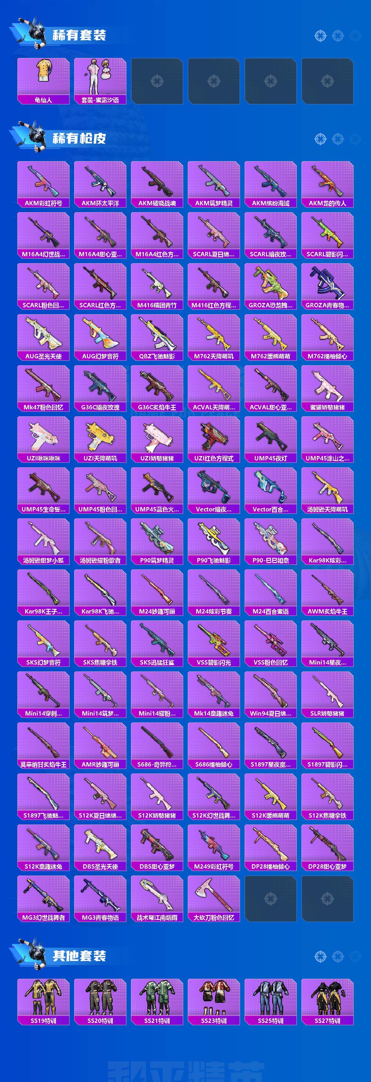 【粉色枪皮】:AKM-百合蜜语,SCAR-L-童趣迷兔,SCAR-L-青春物语,GROZA-焦糖拿铁,AUG-妙趣可丽,UZI-筑梦精灵,Kar98K-巳巳如意,AWM-橘柚倾心,SKS-碧影闪光,Mk14-福马献瑞,SLR-暗夜玫瑰,MG3-炙焰牛王