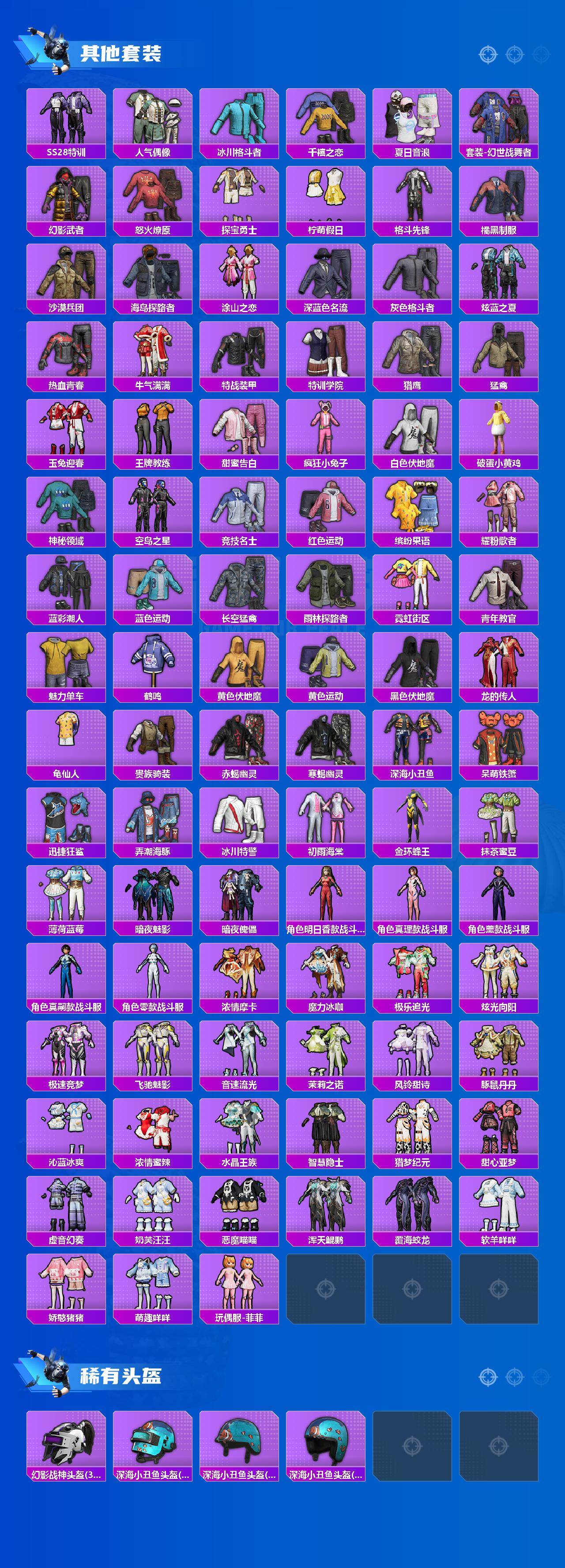 套装-寒蝎幽灵,套装-赤蝎幽灵,套装-深海小丑鱼,套装-粉色回忆,套装-草莓生巧,套装-炙焰红王,套装-暗夜玫瑰,角色-零号机款机体服,角色-初号机款机体服,角色-2号机款机体服,焦糖拿铁套装,套装-碧影闪光,岚岚物语套装,套装-海盐物语,套装-薄荷物语,套装-百合蜜语,套装-幻梦音符,套装-绚丽摇曳,套装-闪耀律动,套装-橘柚倾心,套装-赤焰黑爵,套装-筑梦精灵,套装-甜梦小狐,套装-炙焰牛王,套装-星夜魔法师,套装-暖熊萌萌,套装-寒光使者,套装-呆萌铁蟹,套装-迅捷狂鲨,套装-奶芙汪汪,套装-恶魔喵喵