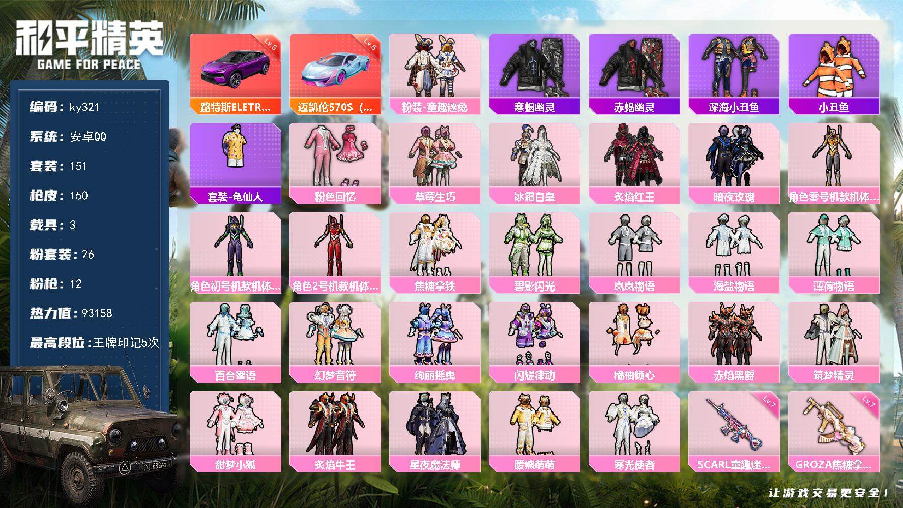 [16988718]安卓 手Q-26粉装-12特效枪-3载具-6粉色飞行器-93158热力值-5王牌印记-151套装-150枪皮