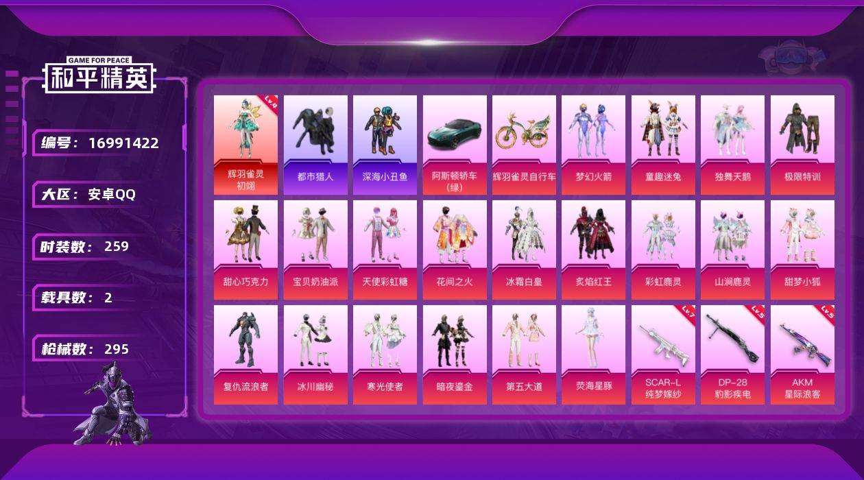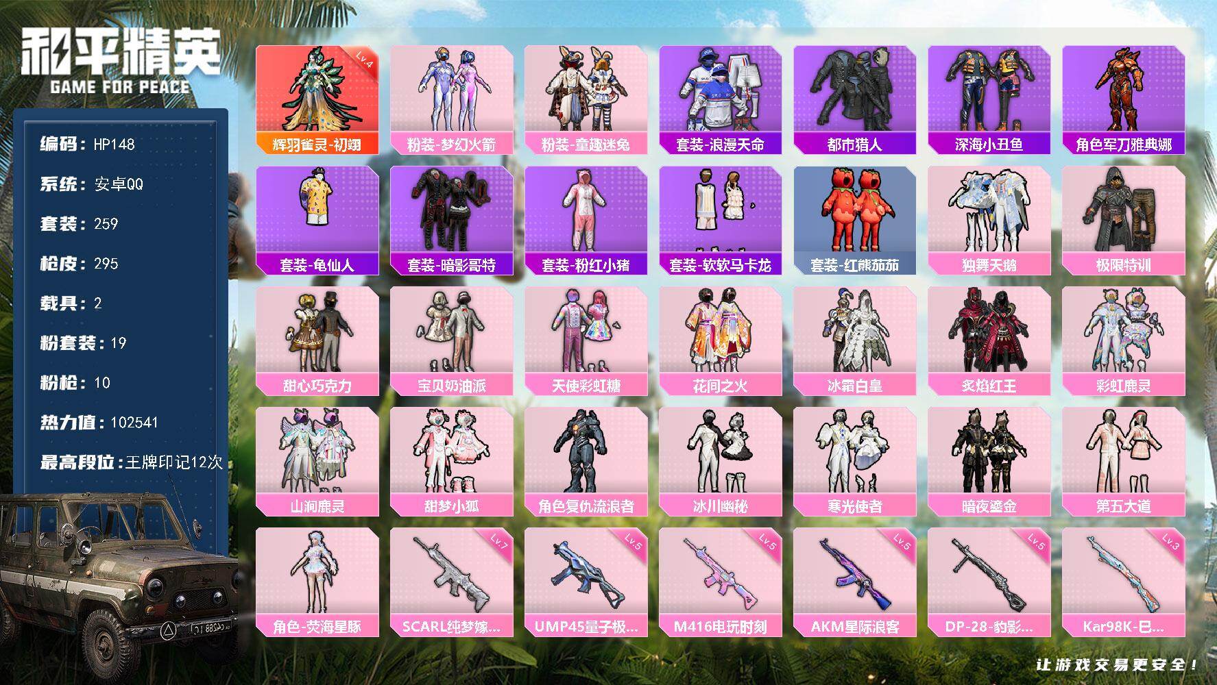 [16991422]安卓 手Q-1神装-19粉装-10特效枪-2载具-3粉色飞行器-102541热力值-12王牌印记-259套装-295枪皮