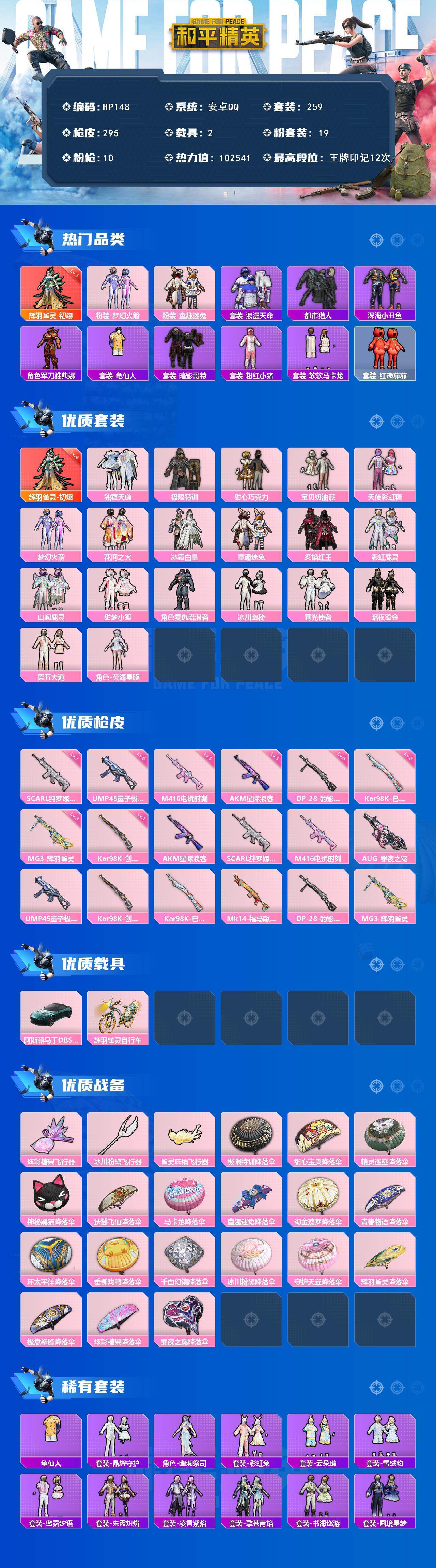 [16991422]安卓 手Q-1神装-19粉装-10特效枪-2载具-3粉色飞行器-102541热力值-12王牌印记-259套装-295枪皮 【红色神装等级】:辉羽雀灵-初翊(四级) 【红色角色神装】:辉羽雀灵-初翊 【热门品类】:粉装-梦幻火箭,粉装-童趣迷兔,套装-浪漫天命,套装-都市猎人,套装-深海小丑鱼,角色-军刀雅典娜,套装-龟仙人,套装-暗影哥特,套装-粉红小猪,套装-软软马卡龙,套装-红熊茄茄 【粉色套装】:粉装-独舞天鹅,粉装-极限特训,粉装-甜心巧克力,粉装-宝贝奶油派,粉装-天使彩虹糖,粉装-梦幻火箭,粉装-花间之火,粉装-冰霜白皇,粉装-童趣迷兔,粉装-炙焰红王,粉装-彩虹鹿灵,粉装-山涧鹿灵,粉装-甜梦小狐,角色-复仇流浪者,粉装-冰川幽秘,粉装-寒光使者,粉装-暗夜鎏金,粉装-第五大道,角色-荧海星豚 【粉色枪皮等级】:AKM-星际浪客(五级),SCAR-L-纯梦嫁纱(七级),M416-电玩时刻(五级),UMP45-量子极限(五级),Kar98K-创世·救赎(一级),Kar98K-巳巳如意(三级),DP-28-豹影疾电(五级),MG3-辉羽雀灵(三级) 【粉色载具】:阿斯顿马丁DBS(绿),辉羽雀灵自行车 【粉色枪皮】:AKM-星际浪客,SCAR-L-纯梦嫁纱,M416-电玩时刻,AUG-罪夜之冕,UMP45-量子极限,Kar98K-创世·救赎,Kar98K-巳巳如意,Mk14-福马献瑞,DP-28-豹影疾电,MG3-辉羽雀灵 【粉色飞行器】:炫彩糖果飞行器,冰川粉黛飞行器,雀灵庇佑飞行器 【粉色降落伞】:极限特训降落伞,甜心宝贝降落伞,精灵迷巫降落伞,神秘黑猫降落伞,扶摇飞仙降落伞,马卡龙降落伞,童趣迷兔降落伞,绚金瑰梦降落伞,青春物语降落伞,环太平洋降落伞,垂柳戏鸭降落伞,千面幻镜降落伞,冰川粉黛降落伞,守护天翼降落伞,辉羽雀灵降落伞,极意拳锋降落伞,炫彩糖果降落伞,罪夜之冕降落伞 【稀有套装】:套装-龟仙人,套装-雪国风尚,套装-炫彩糖果,套装-晶辉守护,角色-幽澜祭司,套装-彩虹兔,套装-云朵鹅,套装-雪绒豹,套装-蜜露汐语,套装-朱霞炽焰,套装-凌霄紫焰,套装-擎苍青焰,套装-书海巡游,套装-画境星梦,套装-琴音绮想,角色-霜刃之御,角色-月烬之祷 【稀有枪皮】:AUG-冰晶雪宝,AKM-四圣焕新,AKM-彩虹符号,AKM-影袭,AKM-星兔领航员