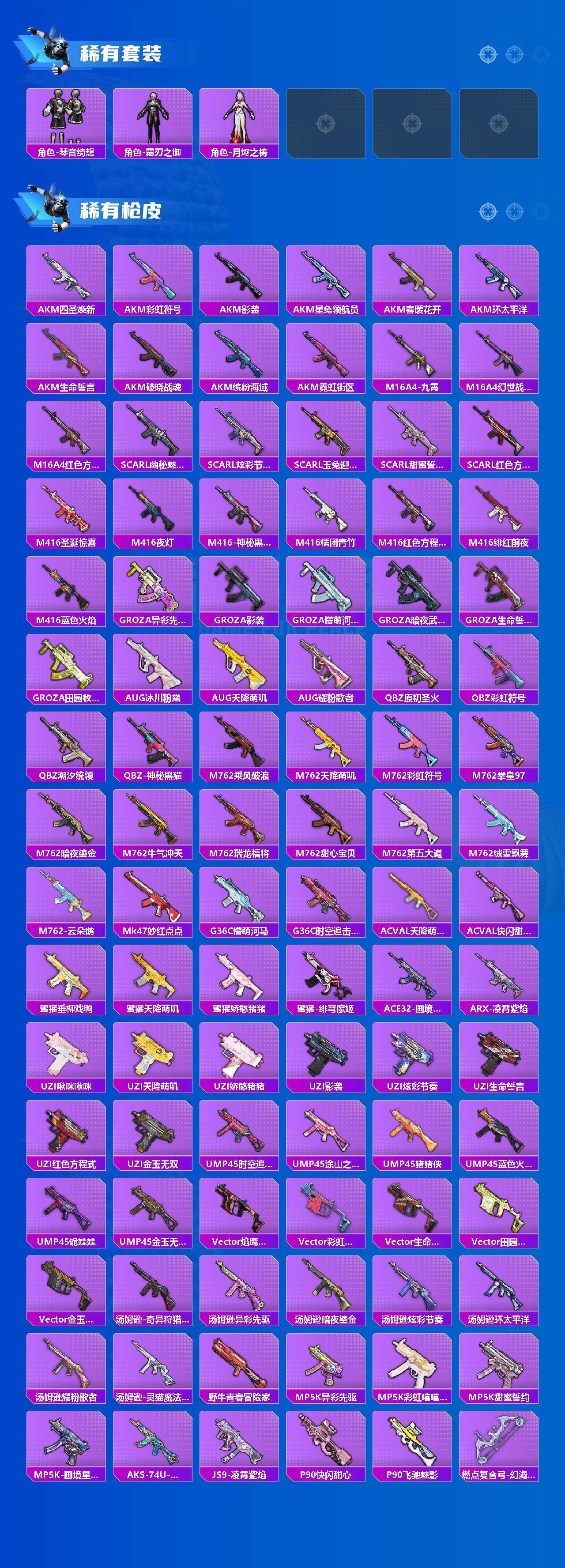 【稀有枪皮】:AUG-冰晶雪宝,AKM-四圣焕新,AKM-彩虹符号,AKM-影袭,AKM-星兔领航员