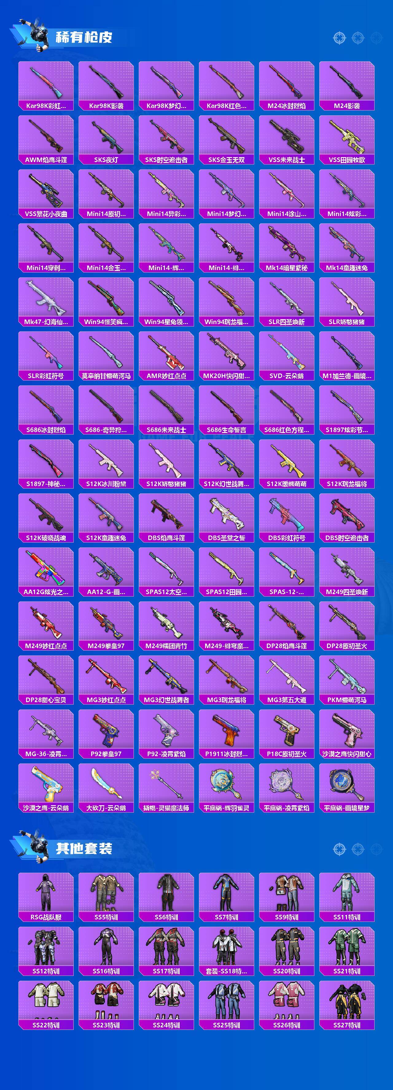 【粉色枪皮】:AKM-星际浪客,SCAR-L-纯梦嫁纱,M416-电玩时刻,AUG-罪夜之冕,UMP45-量子极限,Kar98K-创世·救赎,Kar98K-巳巳如意,Mk14-福马献瑞,DP-28-豹影疾电,MG3-辉羽雀灵