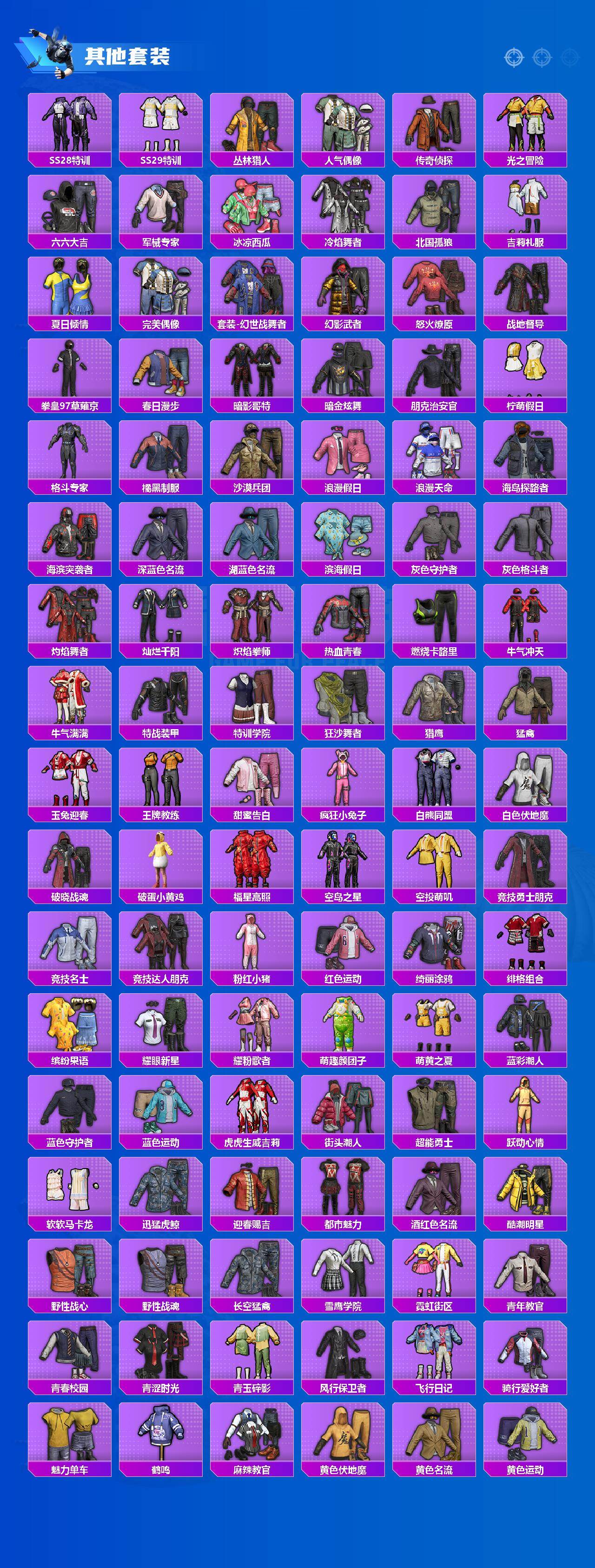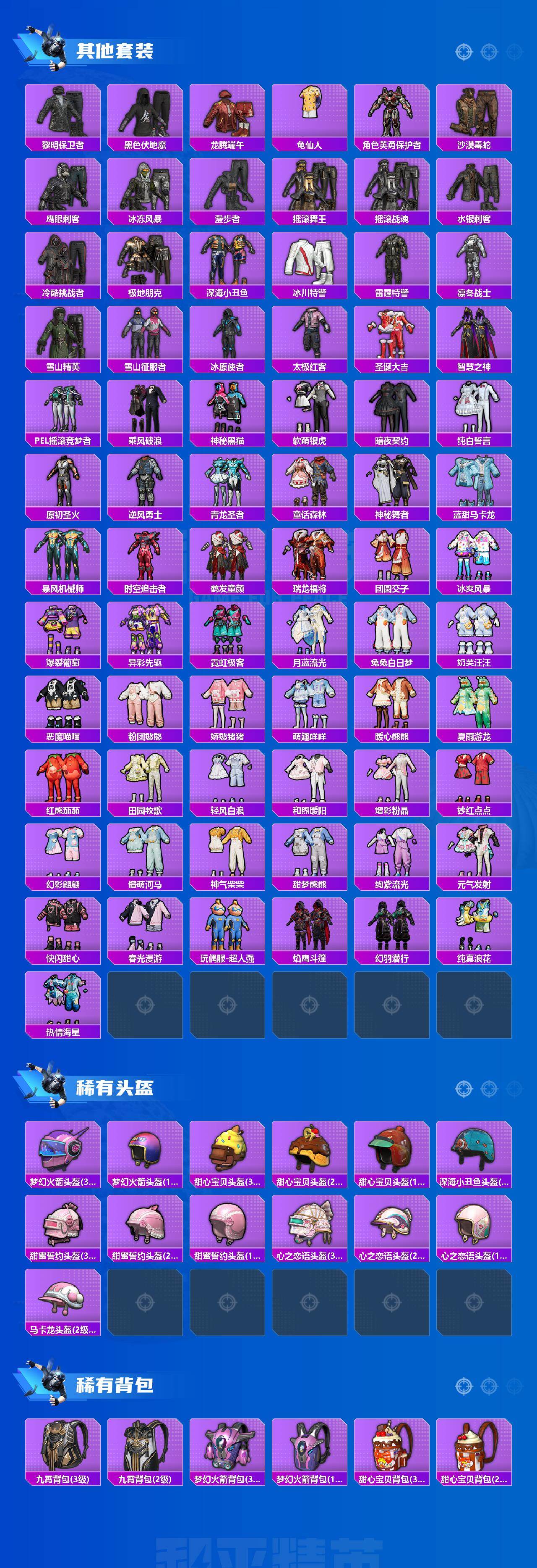 套装-梦幻火箭,套装-都市猎人,套装-深海小丑鱼,独舞天鹅套装,套装-极限特训,套装-宝贝奶油派,套装-天使彩虹糖,套装-花间之火,套装-炙焰红王,套装-彩虹鹿灵,套装-山涧鹿灵,套装-甜梦小狐,角色-复仇流浪者,套装-冰川幽秘,套装-寒光使者,套装-暗夜鎏金,套装-第五大道,套装-鹰眼刺客,套装-神秘黑猫,套装-软萌银虎,兔兔白日梦套装,套装-奶芙汪汪,套装-恶魔喵喵