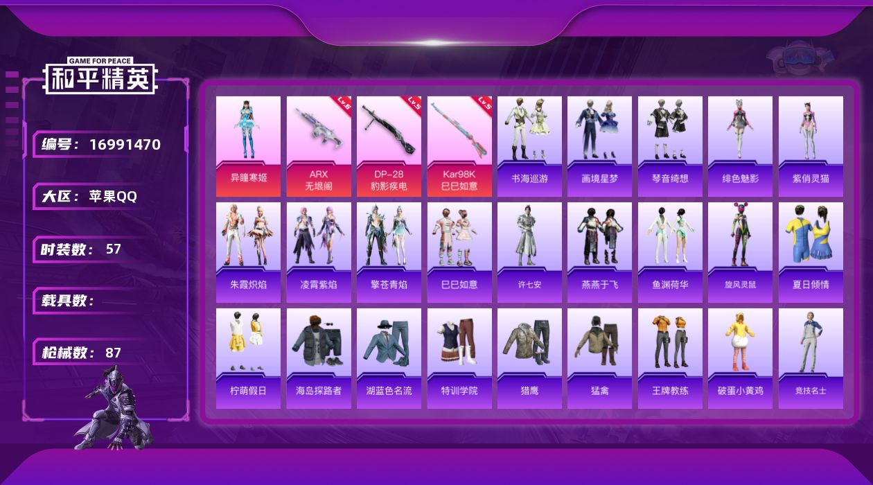 [16991470]苹果 手Q-1粉装-4特效枪-0载具-1粉色飞行器-21512热力值-3王牌印记-57套装-87枪皮 【粉色套装】:角色-异瞳寒姬 【粉色枪皮等级】:ARX-无垠阁(六级),AKS-74U-森灵之息(三级),Kar98K-巳巳如意(五级),DP-28-豹影疾电(五级) 【粉色枪皮】:ARX-无垠阁,AKS-74U-森灵之息,Kar98K-巳巳如意,DP-28-豹影疾电 【粉色飞行器】:炫彩糖果飞行器 【粉色降落伞】:绝对恒星降落伞,千金淑猫降落伞,异瞳寒姬降落伞,极意拳锋降落伞,炫彩糖果降落伞 【稀有套装】:套装-巳巳如意,套装-炫彩糖果,角色-许七安,套装-燕燕于飞,套装-鱼渊荷华,套装-旋风灵鼠,套装-朱霞炽焰,套装-凌霄紫焰,套装-擎苍青焰,角色-绯色魅影,角色-紫俏灵猫,套装-书海巡游,套装-画境星梦,套装-琴音绮想 【稀有枪皮】:AUG-冰晶雪宝,AKM-破晓战魂,SCAR-L-夜灯,SCAR-L-未来战士,M416-红色方程式,M416-蓝色火焰,GROZA-荧海星豚,AUG-耀粉歌者,QBZ-洛神天依,M762-天降萌叽,M762-登顶巅峰,ACE32-画境星梦,ARX-凌霄紫焰,UZI-啾咪啾咪,UZI-红色方程式,UMP45-夜灯,汤姆逊-天降萌叽,MP5K-画境星梦,JS9-凌霄紫焰,P90-巳巳如意,Mini14-耀粉歌者,AMR-鬼刀,MK20-H-净心行者,M1加兰德-画境星梦,S686-巳巳如意,S12K-夜灯,DBS-月影灵韵,AA12-G-画境星梦,M249-彩虹符号,MG3-幻世战舞者,MG-36-凌霄紫焰,P92-凌霄紫焰,短管霰弹-竹节火铳,短管霰弹-星穹咏叹调,突击盾牌-绝对恒星,平底锅-凌霄紫焰,平底锅-画境星梦,破片手榴弹-巳巳如意 【其他套装】:套装-夏日倾情,套装-柠萌假日,套装-海岛探路者,套装-湖蓝色名流,套装-特训学院,套装-猎鹰,套装-猛禽,套装-王牌教练,套装-破蛋小黄鸡,套装-竞技名士,套装-竞技达人朋克,套装-红色运动,套装-绮丽涂鸦,套装-缤纷果语,套装-耀粉歌者,套装-蓝色运动,套装-街头潮人,套装-都市魅力,套装-长空猛禽,套装-魅力单车,套装-黄色运动,套装-黑色伏地魔,套装-冰冻风暴 【稀有背包】:金羽特工背包(1级) 【营地ID】:989168308