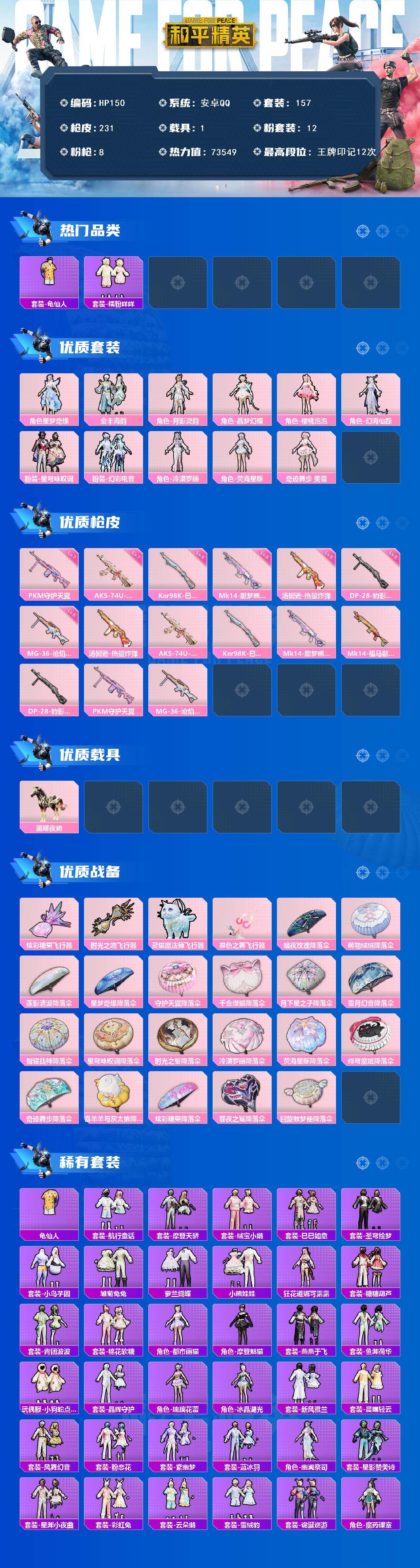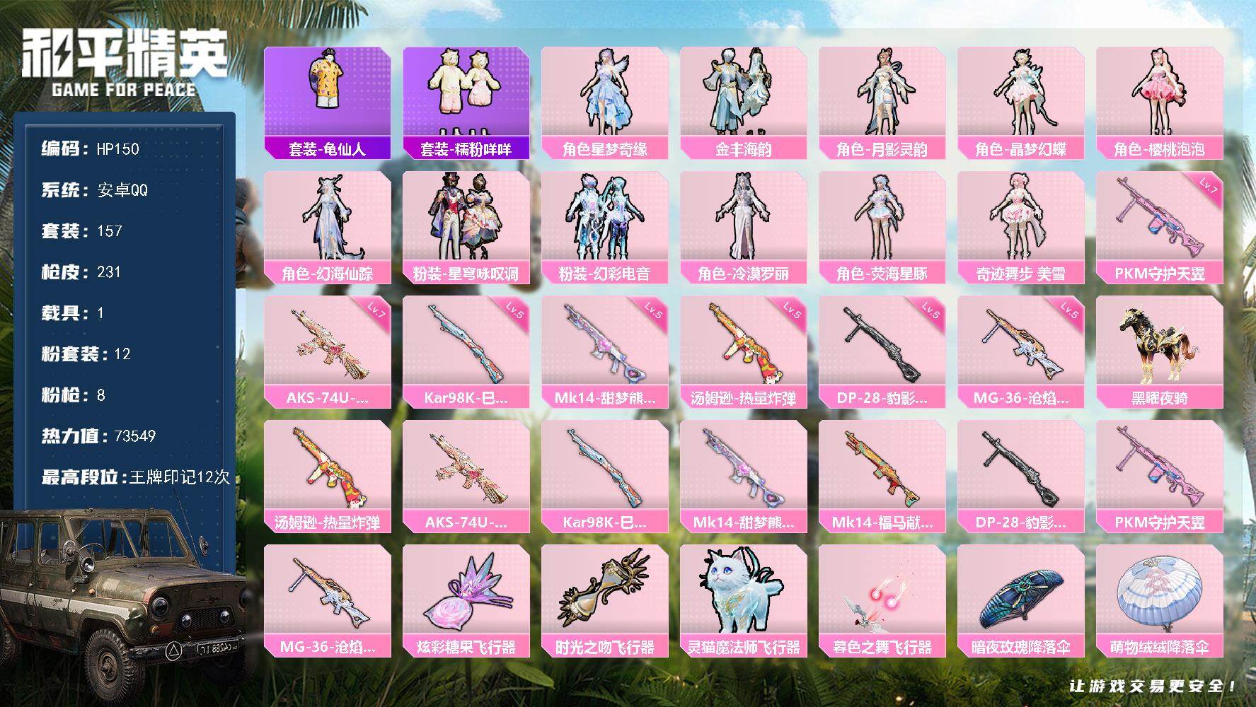 [16991532]安卓 手Q-12粉装-8特效枪-1载具-4粉色飞行器-73549热力值-12王牌印记-157套装-231枪皮