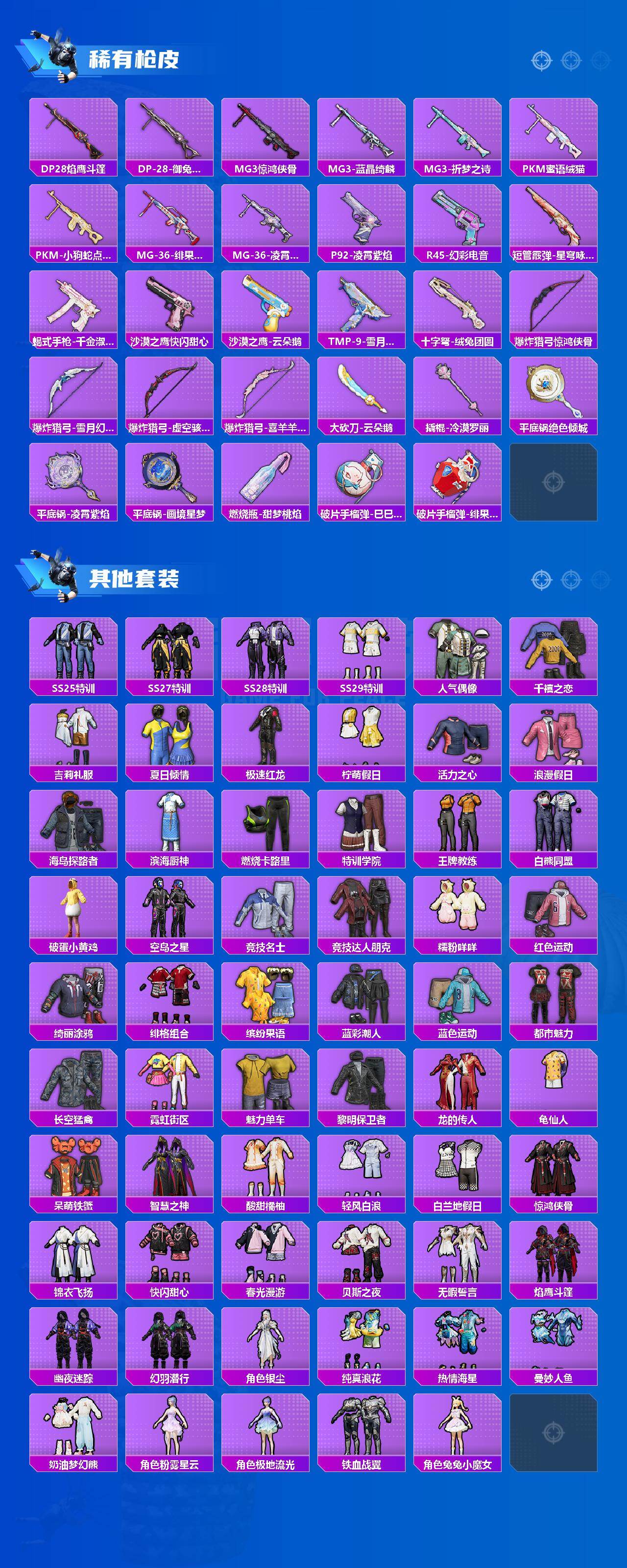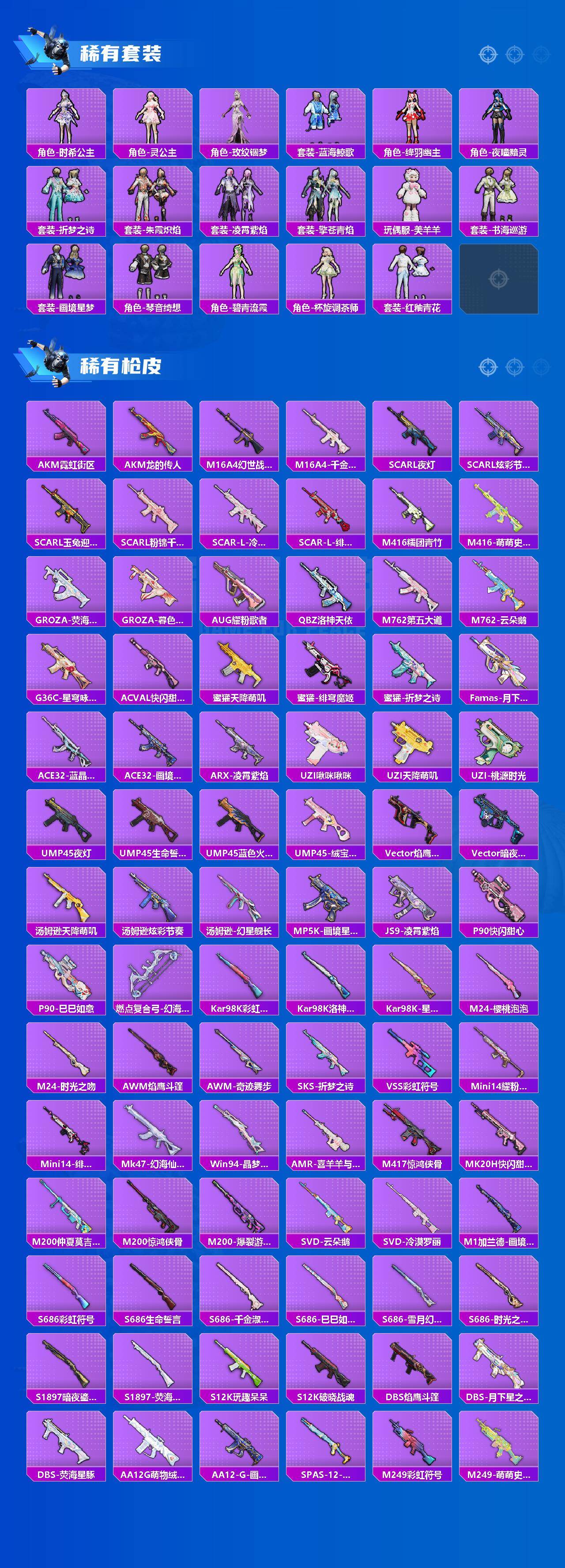 【粉色枪皮】:汤姆逊-热量炸弹,AKS-74U-星穹咏叹调,Kar98K-巳巳如意,Mk14-甜梦熊击,Mk14-福马献瑞,DP-28-豹影疾电,PKM-守护天翼,MG-36-沧焰双生