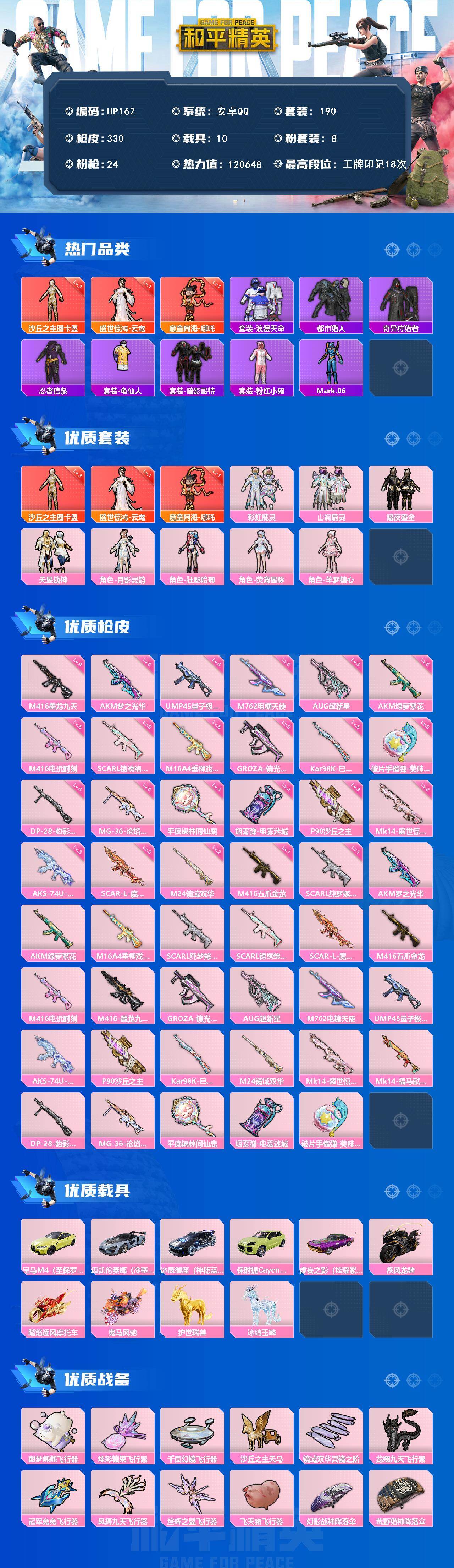 [16992344]安卓 手Q-3神装-8粉装-24特效枪-10载具-12粉色飞行器-120648热力值-18王牌印记-190套装-330枪皮