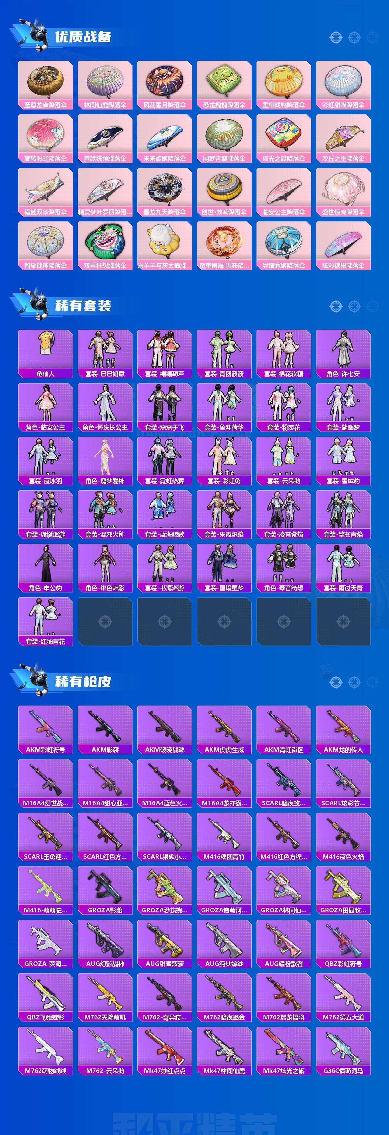 - [12845891]【1238】安卓 手Q-8粉装-7特效枪-3载具-5粉色飞行器-93890热力值-21王牌印记-205套装-289枪皮 【热门品类】:套装-奇异狩猎者,套装-龟仙人,套装-粉红小猪,角色-Mark.06 【粉色载具】:玛莎拉蒂MC20(星石白),玛莎拉蒂Quattroporte(夜幕蓝),焰龙咆哮 【粉色套装】:粉装-王牌四分卫,粉装-暗夜玫瑰,角色-复仇流浪者,粉装-第五大道,粉装-心之回忆,粉装-莲影清波,角色-天鹅座 冰河,粉装-幻彩电音 【粉色枪皮等级】:AKM-梦之光华(六级),SCAR-L-青春物语(七级),GROZA-镜光银凌(五级),M762-甜蜜誓约(七级),Kar98K-巳巳如意(一级),AMR-智耀战神(五级),DP-28-豹影疾电(五级) 【粉色枪皮】:AKM-梦之光华,SCAR-L-青春物语,GROZA-镜光银凌,M762-甜蜜誓约,Kar98K-巳巳如意,AMR-智耀战神,DP-28-豹影疾电 【粉色飞行器】:机甲封神飞行器,齐天大圣飞行器,太空嘟嘟飞行器,霓虹漫游飞行器,星空武士飞行器 【粉色降落伞】:四圣焕新降落伞,银刃赛罗降落伞,王牌四分卫降落伞,星之彼岸降落伞,洛神天依降落伞,筑梦精灵降落伞,环太平洋降落伞,旋转彩虹降落伞,第五大道降落伞,纯梦嫁纱降落伞,龙珠超降落伞,黄族统领降落伞,未来歌姬降落伞,初号机 觉醒Ver.降落伞,未来领航者降落伞,幻彩电音降落伞,时光之誓降落伞 【稀有套装】:套装-龟仙人,套装-巳巳如意,套装-雏菊兔兔,套装-萝兰蝴蝶,套装-小熊娃娃,套装-先驱飞行员,套装-糖糖葫芦,套装-青团波波,套装-燕燕于飞,套装-鱼渊荷华,套装-粉恋花,套装-紫幽梦,套装-蓝冰羽,套装-云朵鹅,套装-雪绒豹,角色-时希公主 【稀有枪皮】:AKM-四圣焕新,AKM-墨染幽兰,AKM-夜灯,AKM-彩虹符号,AKM-影袭,AKM-恐龙拽拽,AKM-星之彼岸,AKM-灼热熔岩,AKM-生命誓言,AKM-破晓战魂,AKM-缤纷海域,AKM-萌趣颜团子,AKM-虎虎生威,AKM-霓虹街区,AKM-龙的传人,M16A4-幻世战舞者,M16A4-甜心亚梦,M16A4-红色方程式,SCAR-L-幽秘魅影,SCAR-L-流星咚咚,SCAR-L-炫彩节奏,SCAR-L-玉兔迎春,SCAR-L-红色方程式,SCAR-L-黄金龙骨,SCAR-L