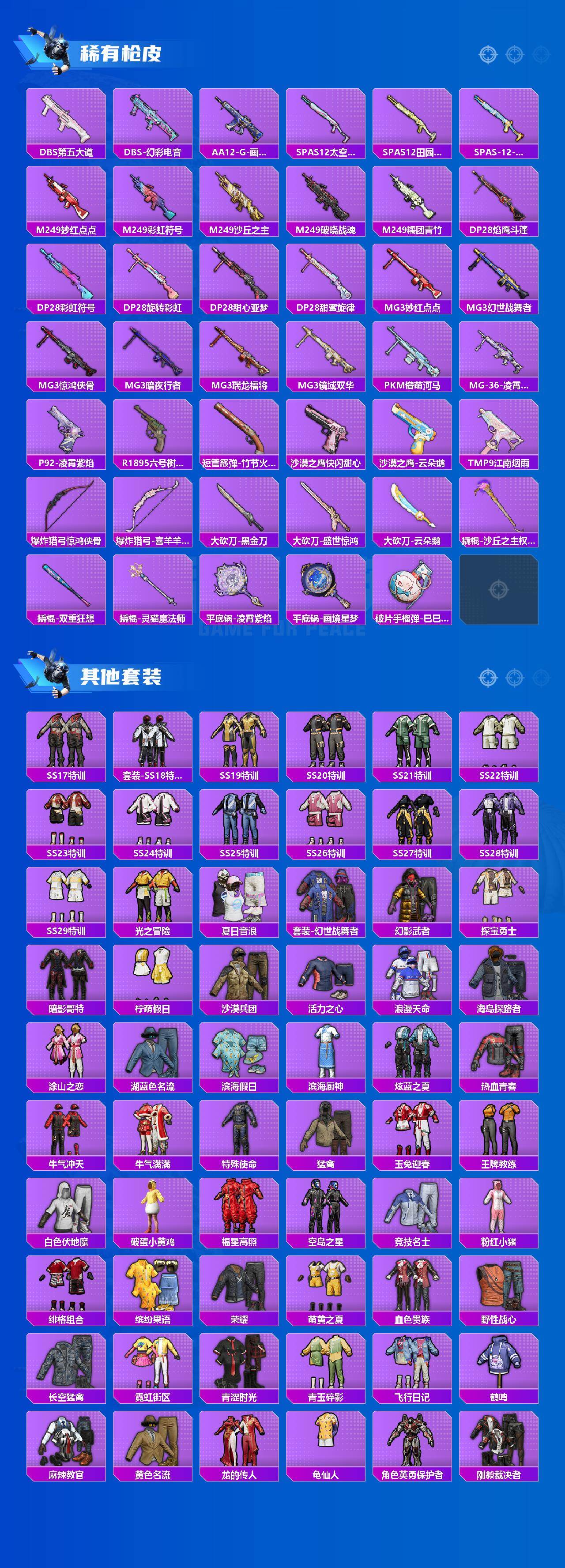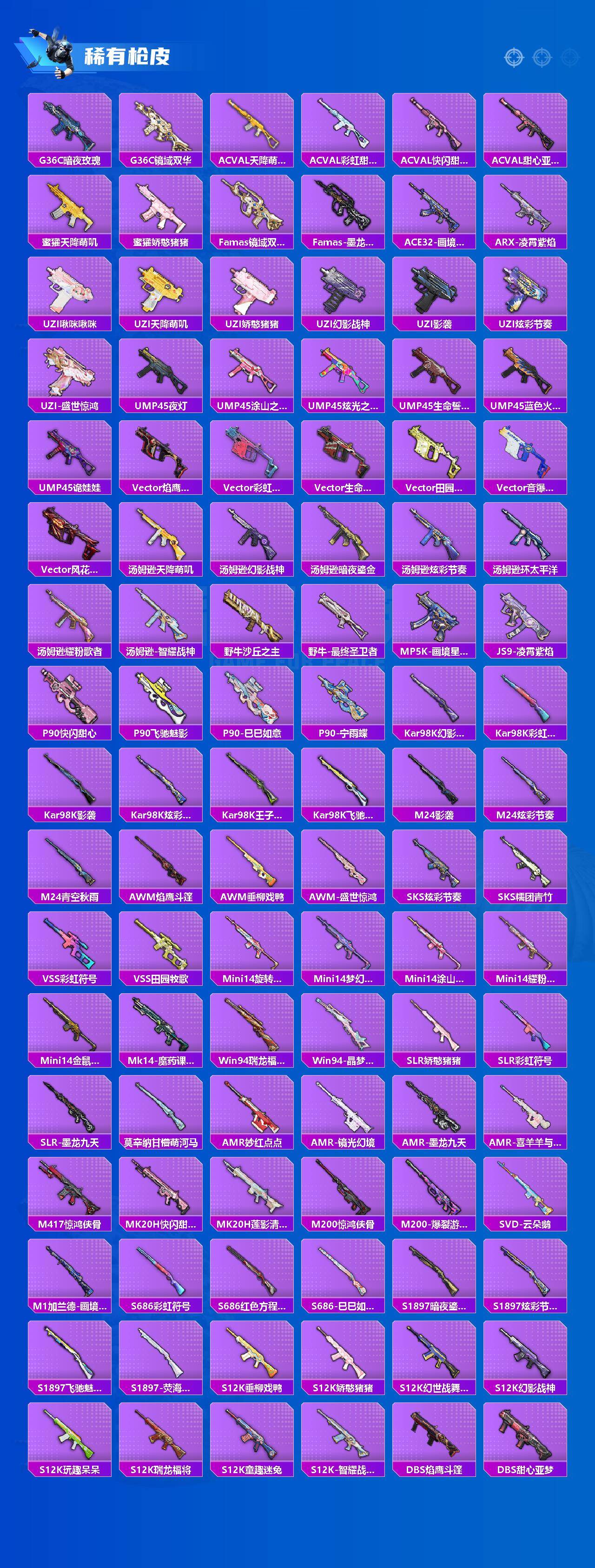 AKM-梦之光华,AKM-绿萝繁花,M16A4-垂柳戏鸭,SCAR-L-纯梦嫁纱,SCAR-L-锦绣绵绵,M416-五爪金龙,M416-电玩时刻,M416-墨龙九天,GROZA-镜光银凌,AUG-超新星,M762-电糖天使,UMP45-量子极限,P90-沙丘之主,Kar98K-巳巳如意,M24-镜域双华,Mk14-盛世惊鸿,平底锅-林间仙鹿